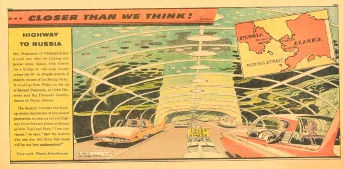 А вот автомобили-беспилотники и электромобили можно с полным правом посчитать сбывшимися предсказаниями. Ожидается, что в ближайшее время наши дороги будут заполнены ими. Правда, автомагистраль, соединяющая Россию и Аляску, как на рисунке ниже, пока еще даже не спроектирована.