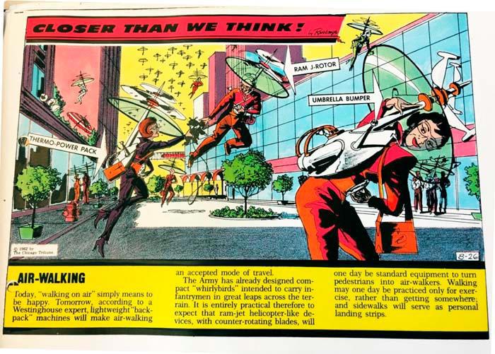 Ну и, конечно, не мог художник умолчать о главной мечте человечества. В его будущем люди летают с помощью небольших персональных вертолетов. Что-то подобное уже, конечно, есть, остается дождаться, когда мини-летающие средства войдут в обиход, и можно будет считать, что будущее наступило.