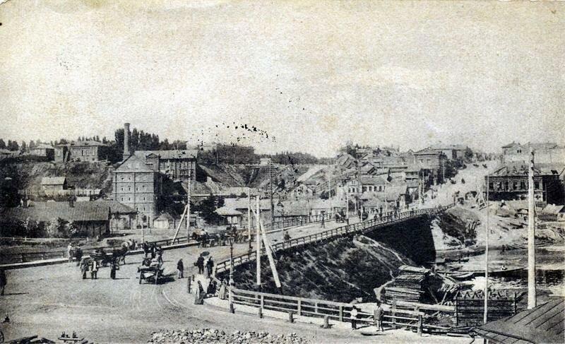 Второй мост был тоже деревянным. Он простоял до лета 1912 года и был одним из самых любимых объектов фотографов конца девятнадцатого-начала двадцатого веков. По снимкам интересно проследить и экономическое развитие самого Города за небольшой в общем-то период - если в семидесятых и восьмидесятых годах девятнадцатого века в пойме преобладали деревянные дома, то позже на их месте появляются кирпичные здания и предприятия (мельницы, мыловаренный и горчичные заводы, ватная фабрика), подводится электричество (видны столбы электролинии) - бурно развивается промышленность: