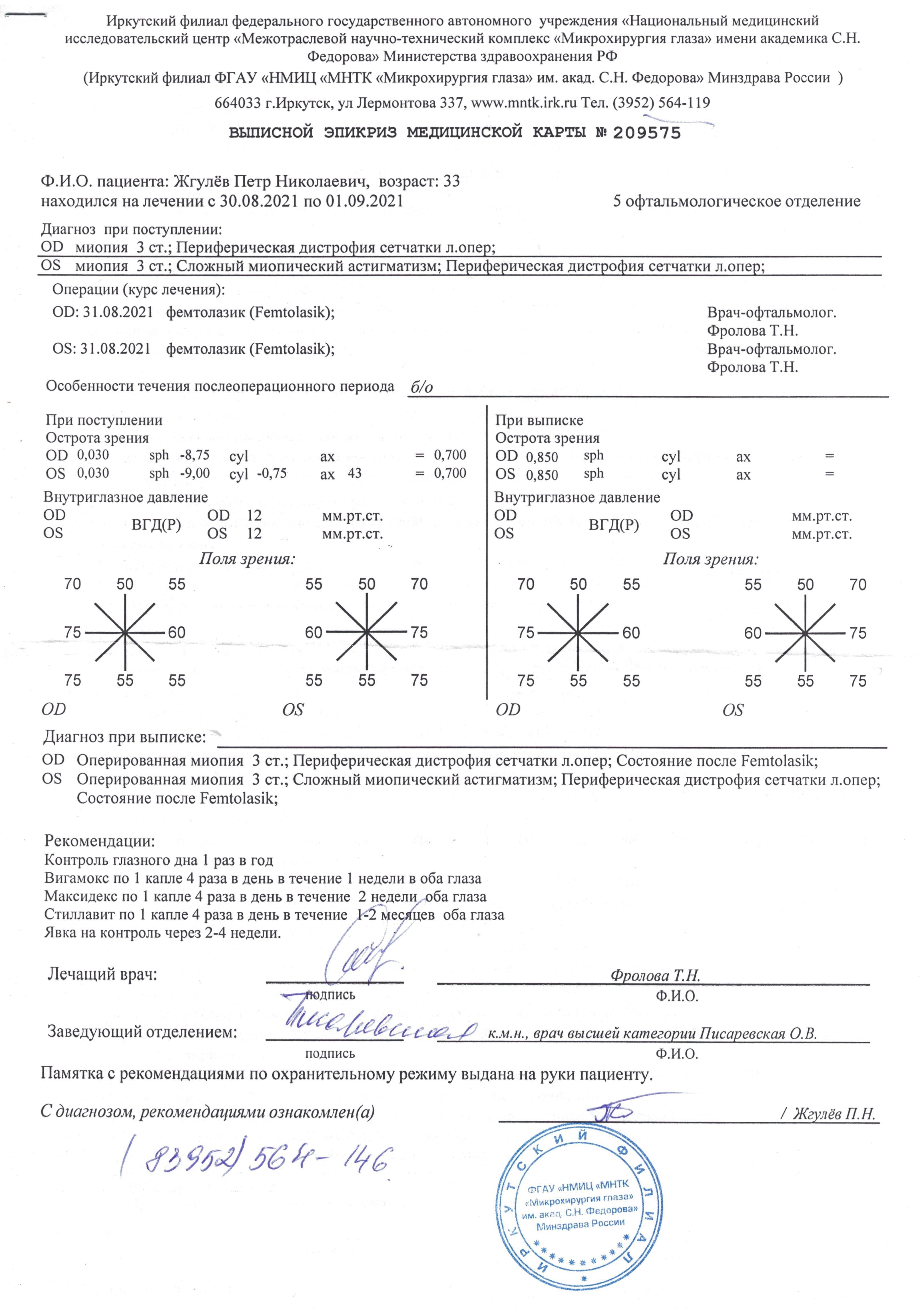 Во вторник, 31.08.2021, сделал коррекцию зрения в Иркутской МНТК. Операция фемтоласик, прошла успешно. Было -8,5 и -9, стало 0 на оба глаза. Не больно, не страшно, риск невелик, если думаете сделать - оно того стоит.