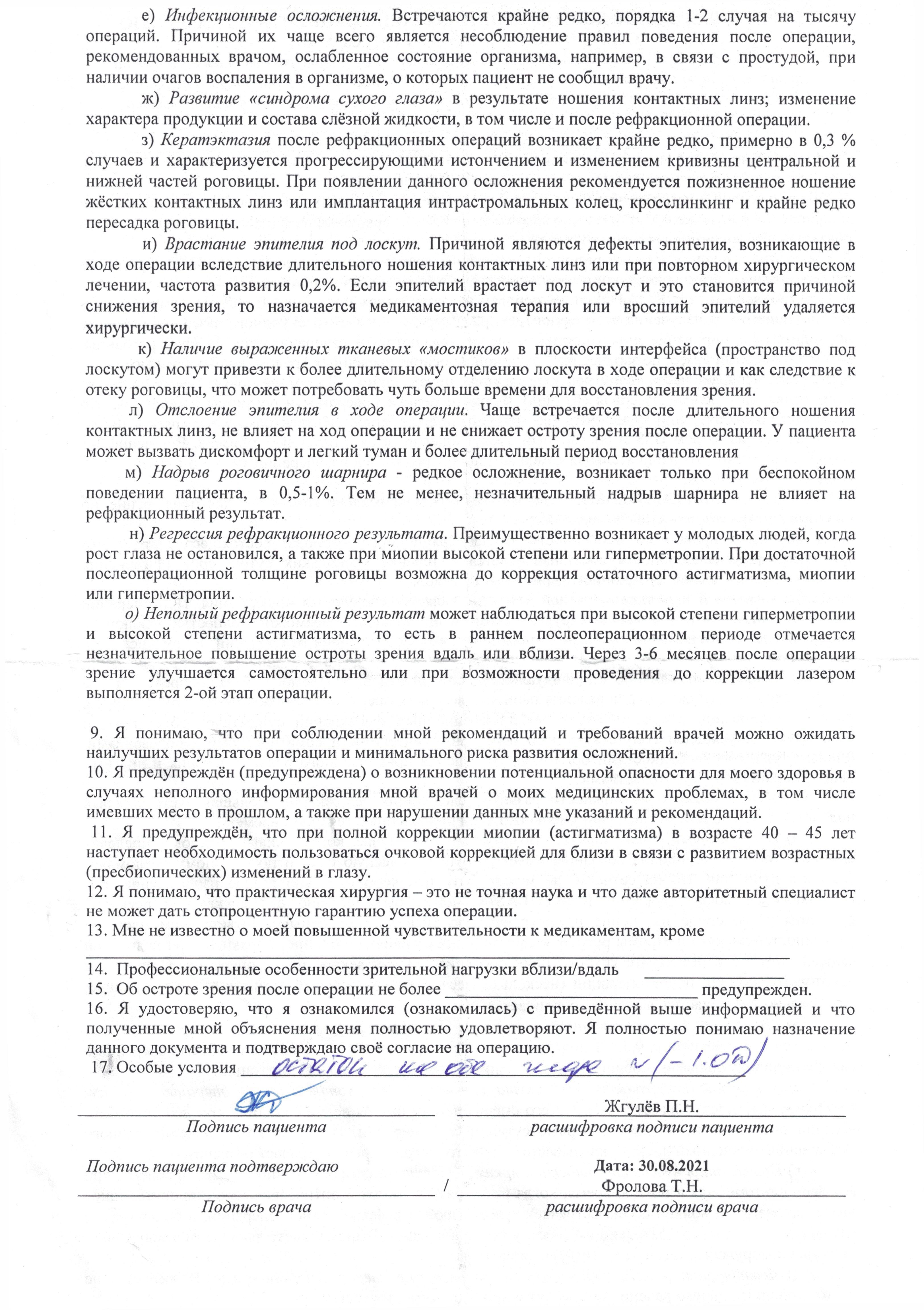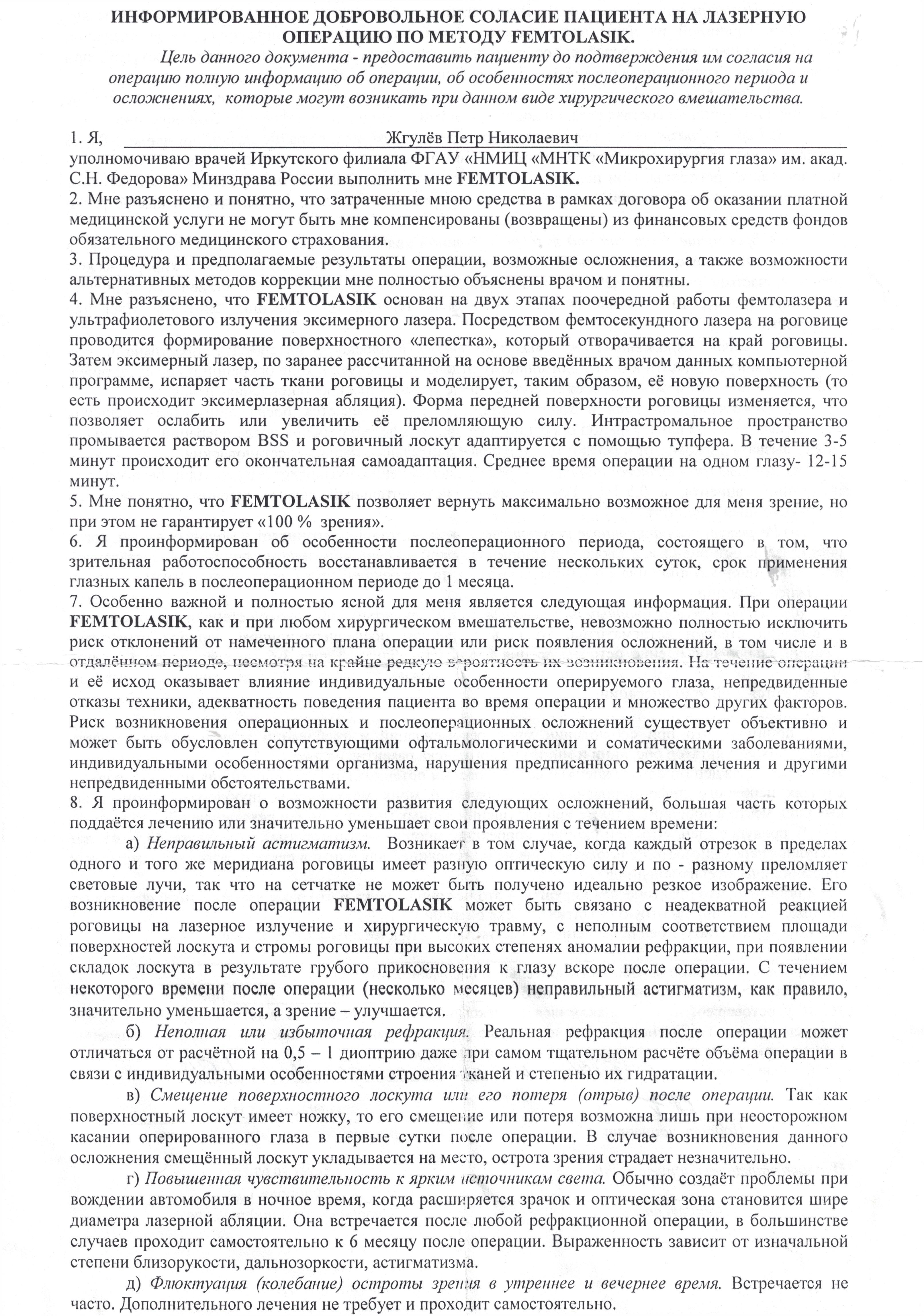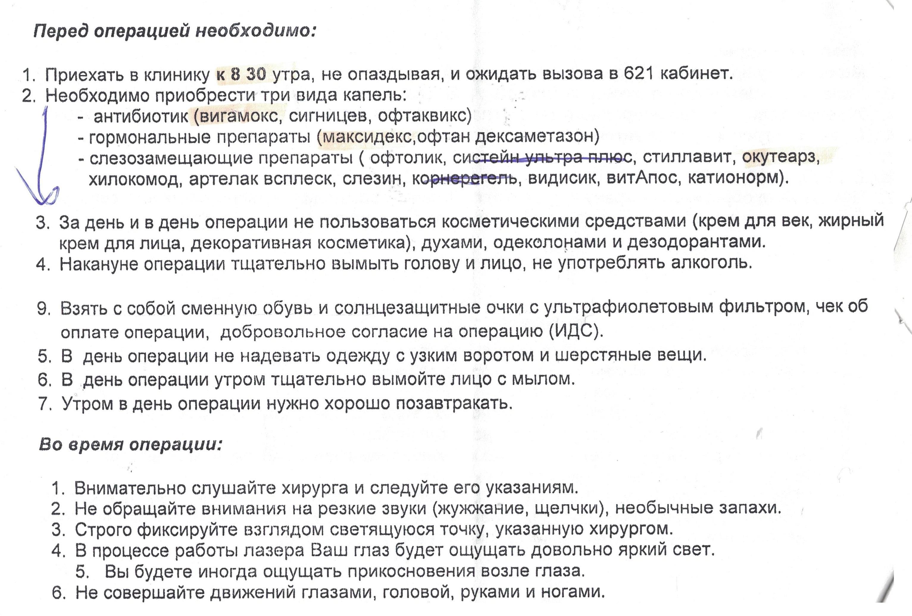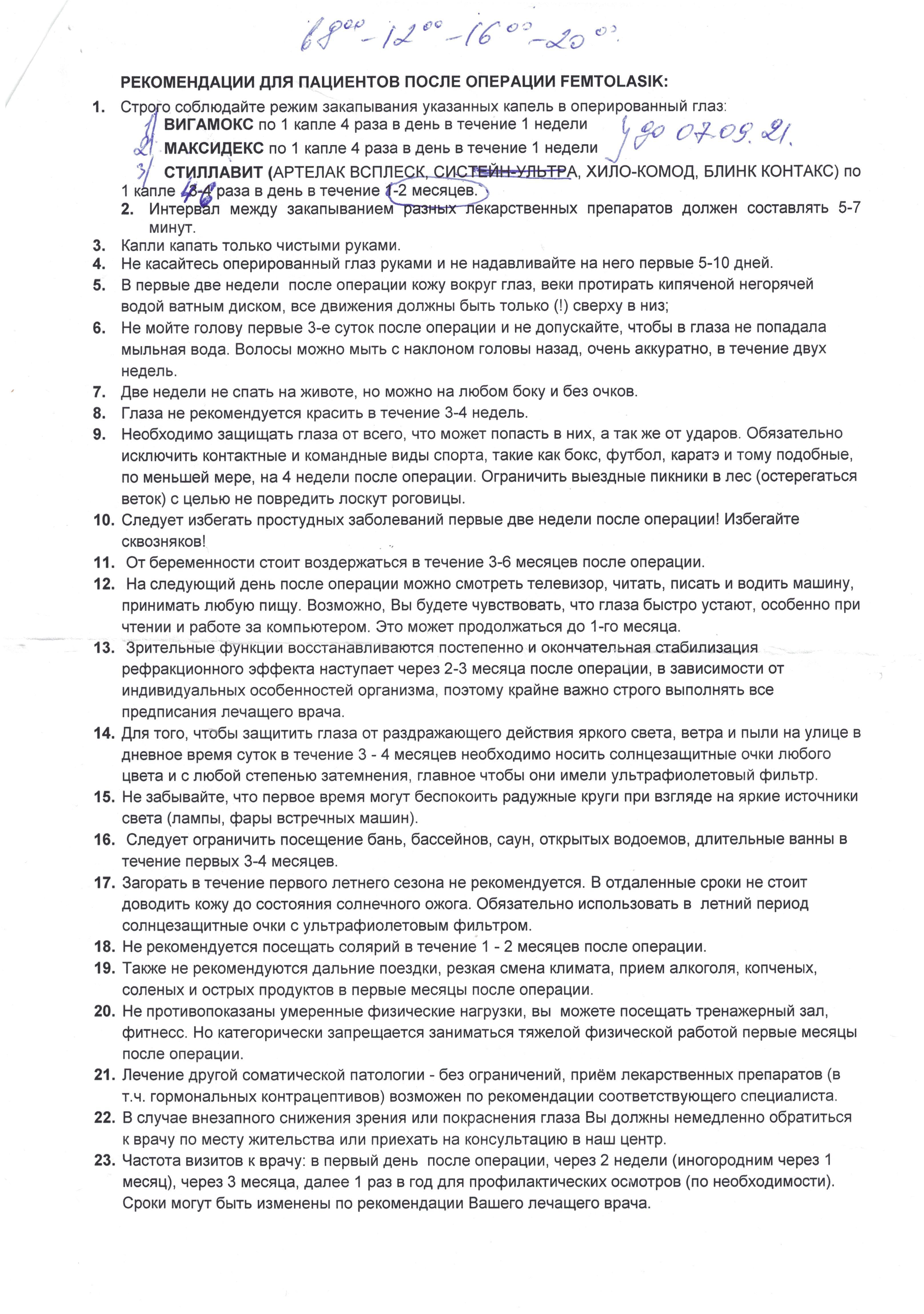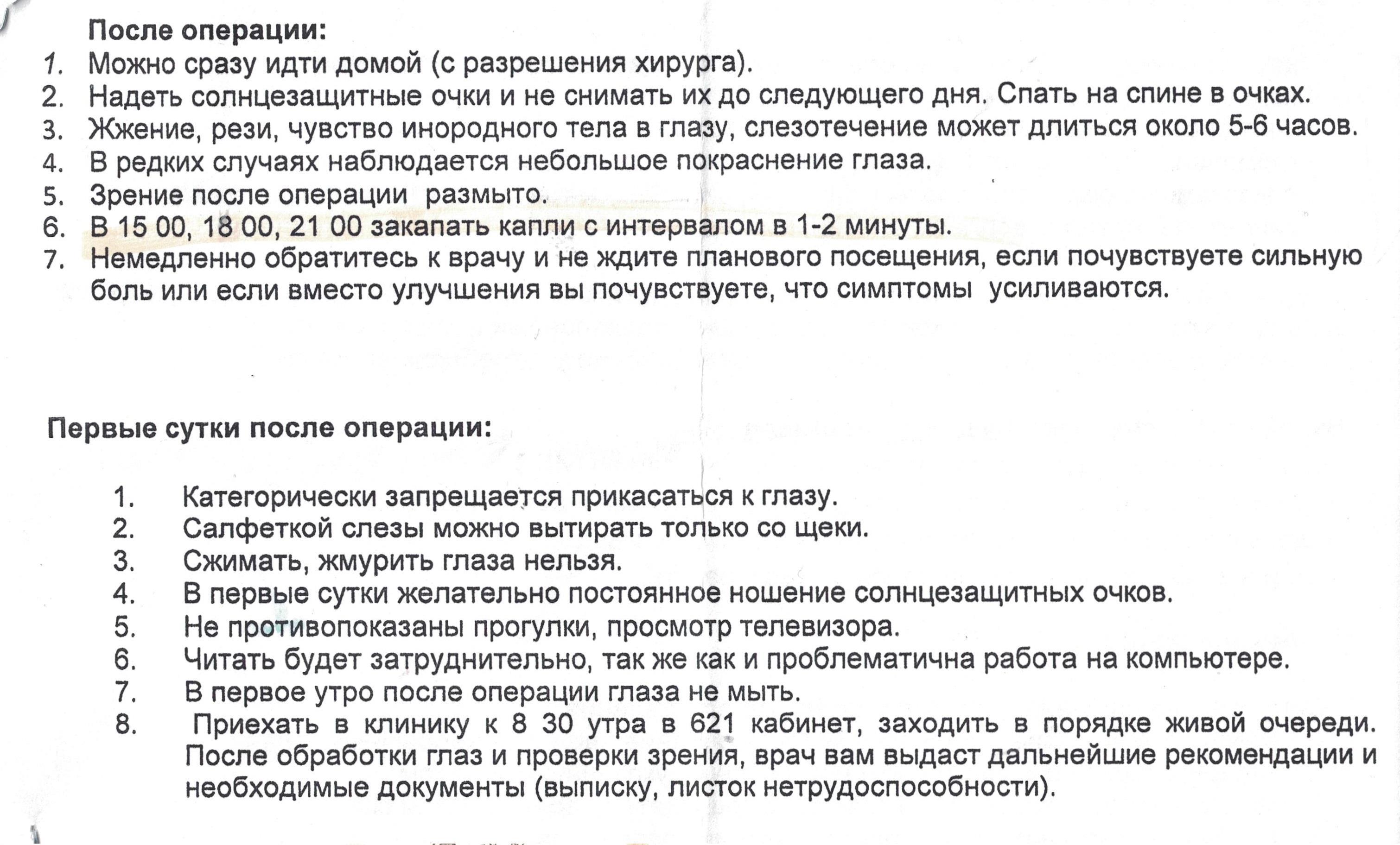 Под конец обрадовали что даже фемтоласиком полное восстановление не получится, ожидается примерно -1, с некоторой погрешностью. Минус огромный, а роговица тонкая - затянул с операцией. Ну, се ля ви, как говорится. Кроме того выдали бумагу, с возможными последствиями и требуемыми действиями. Изучал и подписывал я ее уже дома, потому что в клинике из-за капель ничего прочитать не мог.