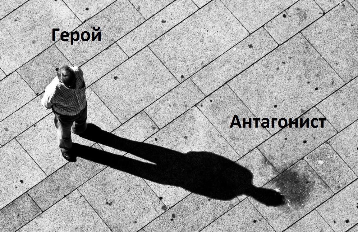 Долго в голове летала примитивная схема. Как изобразить антагониста? Есть герой, а антагонист тогда должен быть его тенью? И соответственно чем больше тень, тем значимей выглядит в глазах читателя герой. Тем существенней победа героя и сильнее эффект сопереживания.