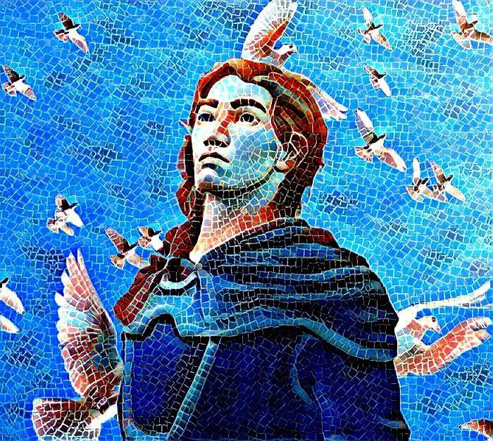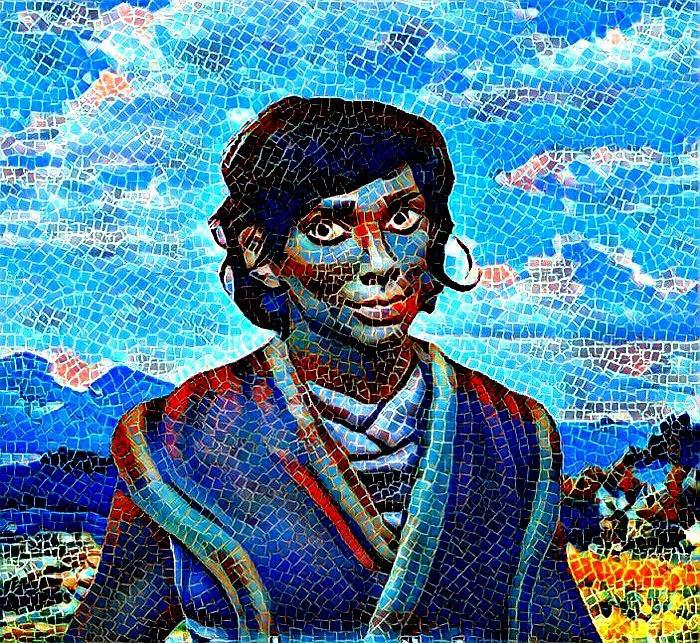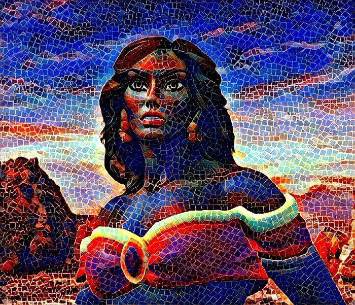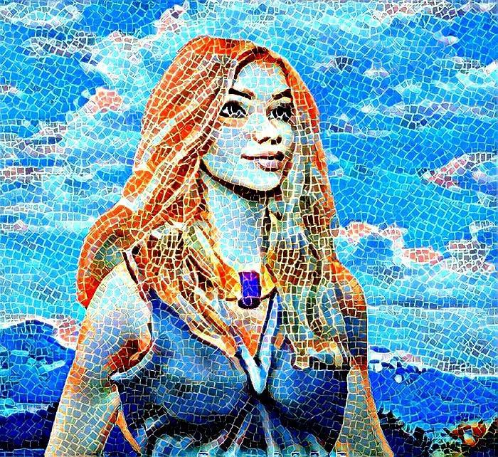 В графике - проще. Графика очень скрывает изъяны раскраски, всё равно выходит красиво. Но мне хотелось попробовать сделать цветные картинки - и я изобразил в цвете Жанну-Яблоню из книжки "Корона, Огонь и Медные Крылья". Там всё очень цветное, яркие-яркие такие тропики - и я сделал в Painnt имитацию мозаики. Для особой сказочности.