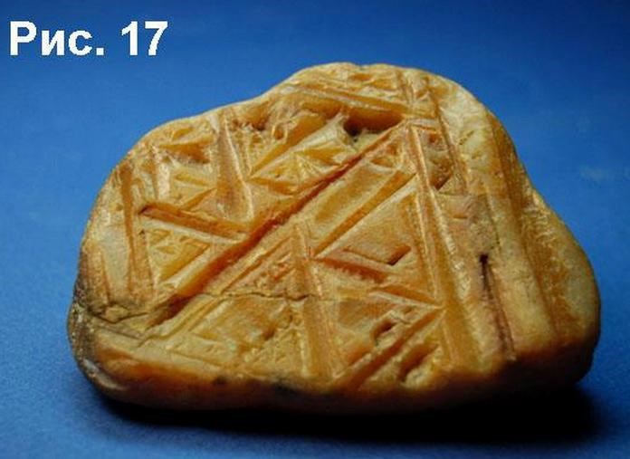 Этот камешек получил название «Ямальская скрижаль» видимо потому, что, посмотрев на него, много народу, не сговариваясь сразу стали поминать Гиперборею, Великий Потоп и прочие легендарные вещи. И нужно заметить, было от чего - камешек нашли в карьере, где добывали щебёнку. Отложения в датской лаборатории датировали где-то 98 тыс. годами. Второй камень нашёл в 2001 году в песчаном карьере под Новым Уренгоем Дмитрий Николаевич Горячев и теперь известен под его именем. Вот фото «камня Горячева: