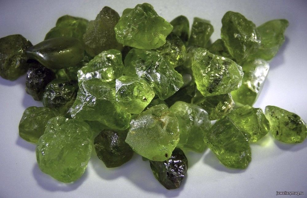 Вот, например, целый ряд странных камешков, про которые неожиданно заговорили совсем недавно. Сначала про материал. Это один из самых древних минералов, на который обратили внимание люди. На древнегреческом его называли хризолитом, то есть «золотым камнем». Ну, золотой не золотой – сейчас его относят к полудрагоценным камням, но успехом он пользуется. Ювелиры его называют перидотом, а геологи – оливином. При искусственном освещении он меняет цвет на зелёный, за что его иногда называют «вечерним изумрудом». Вообще-то он зелёный, но с различными оттенками от золотистого до бурого. Находят его чуть не везде. Говорят, что даже в метеоритах он встречается. Даже в необработанном виде выглядит весьма привлекательным: