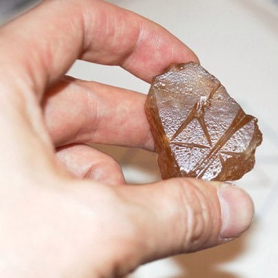 В общем находок со временем стало так много, что количество перешло-таки в качество и на место обнаружения «камня Горячева» в 1916 году Российским Географическим Обществом была организована мини-экспедиция. Участники вполне отдавали себе отчёт в том, что прошедшие со дня обнаружения камня 15 лет оптимизма не добавляют, но лучше сделать хоть что-то, чем не делать ничего… Проводником в экспедиции был сам Горячев. Прибыв на место, исследователи обнаружили страшное – карьер, где был обнаружен камень, давно засыпали, а на этом месте надёжно устроилась ЛЭП. Поэтому решили поискать другое подходящее место. Такое нашлось в 30 км от города. Это был большой песчаный карьер. Надежды было мало, но участники решили, что если и не найдут ничего, то хоть самоцветиков смогут на сувениры насобирать. Однако чудо всё же случилось – камень нашли, да ещё какой! Нет, размерами он поразить не мог – мелковат оказался. Но зато на этот раз треугольники оказались не на одной стороне камня, а на нескольких. Вот его фотография: