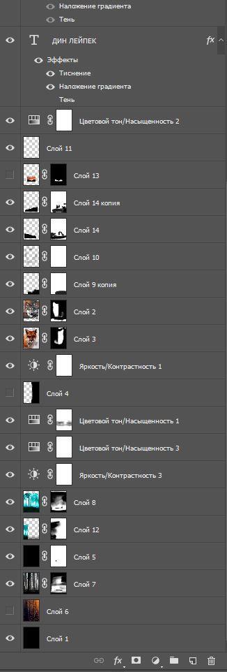 Наложение слоев, маски, черный градиент и цветокоррекция сводят все это в единую композицию за 16 слоев.