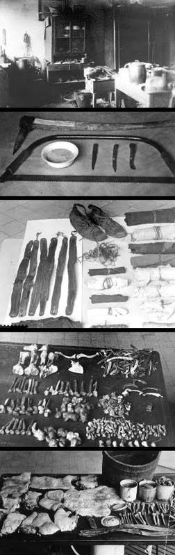 Первое, что увидели в комнате, было большое количество костей, а также 15 кусков мяса, лежавших в деревянной миске с соляным раствором. Это были человечьи кости и человечье мясо. Мясо было с кожей и принадлежало к разным частям тела. Головы, рук, ног, шеи недоставало.