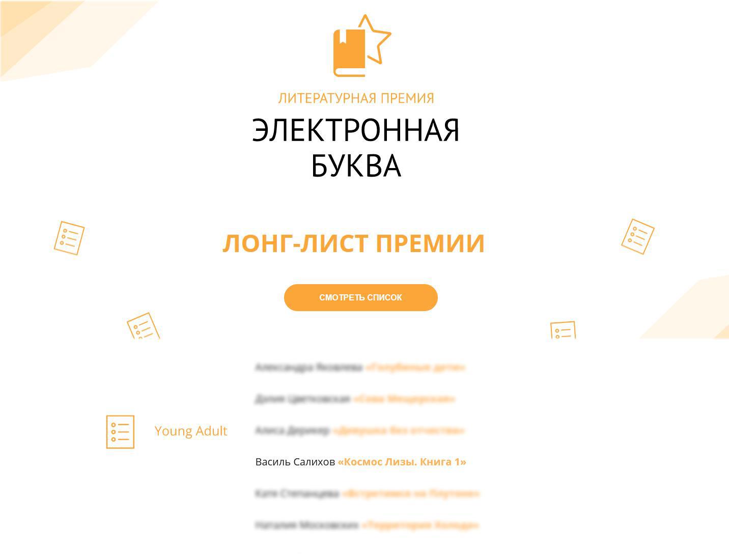 Вот решил в этом году поучаствовать со своей книгой для подростков в жанре "фантастика" - "Космос Лизы" в номинации "Young adult". Представляете, каково же было мое удивление, когда на вчерашнем вебинаре, посвященном лонг-листу и представлению конкурсного жюри, в списке промелькнула моя фамилия!!!)