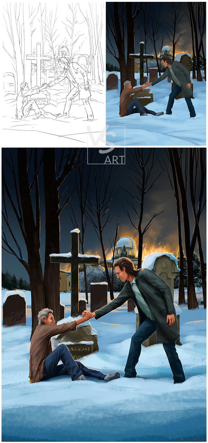 Что касается самого исполнения, было довольно удобно работать, поскольку автор предоставил много рефов и дал четкое описание персонажей. Сложнее всего было не сделать арт мрачным, поскольку действие происходит ночью и пожар на дальнем плане. Мне кажется получилось интересно и даже немного загадочно, а что еще нужно для хорошей обложки?)