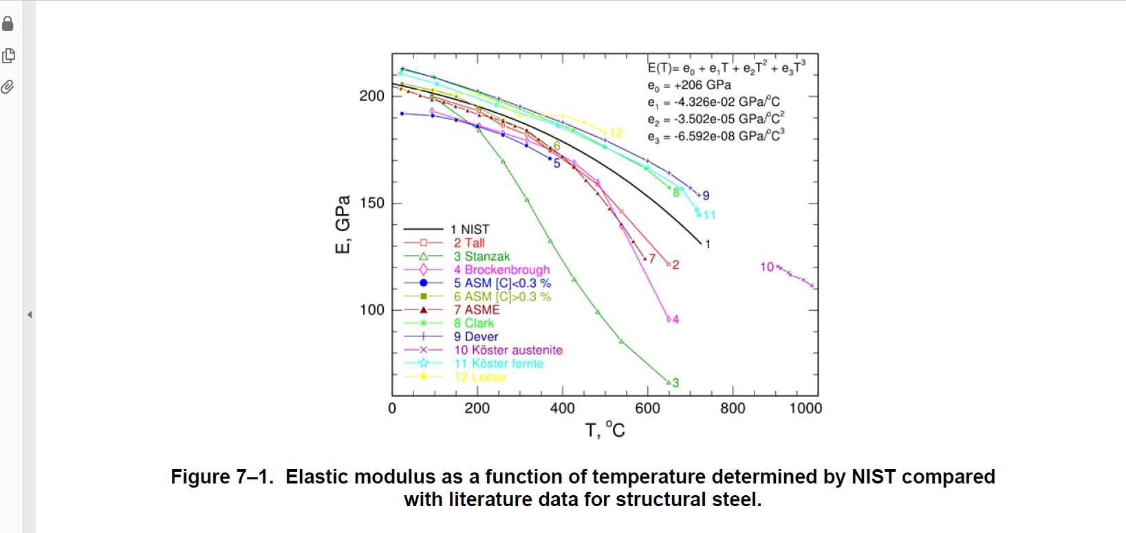 Отмечу что про модуль упругости сталей, используемых при строительстве в зависимости от температуры в отчете, не забыли. Вот графики разных стандартов: