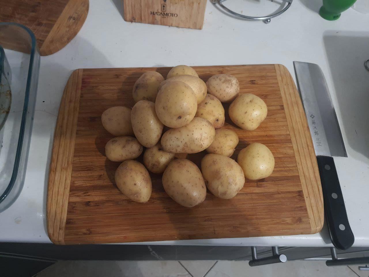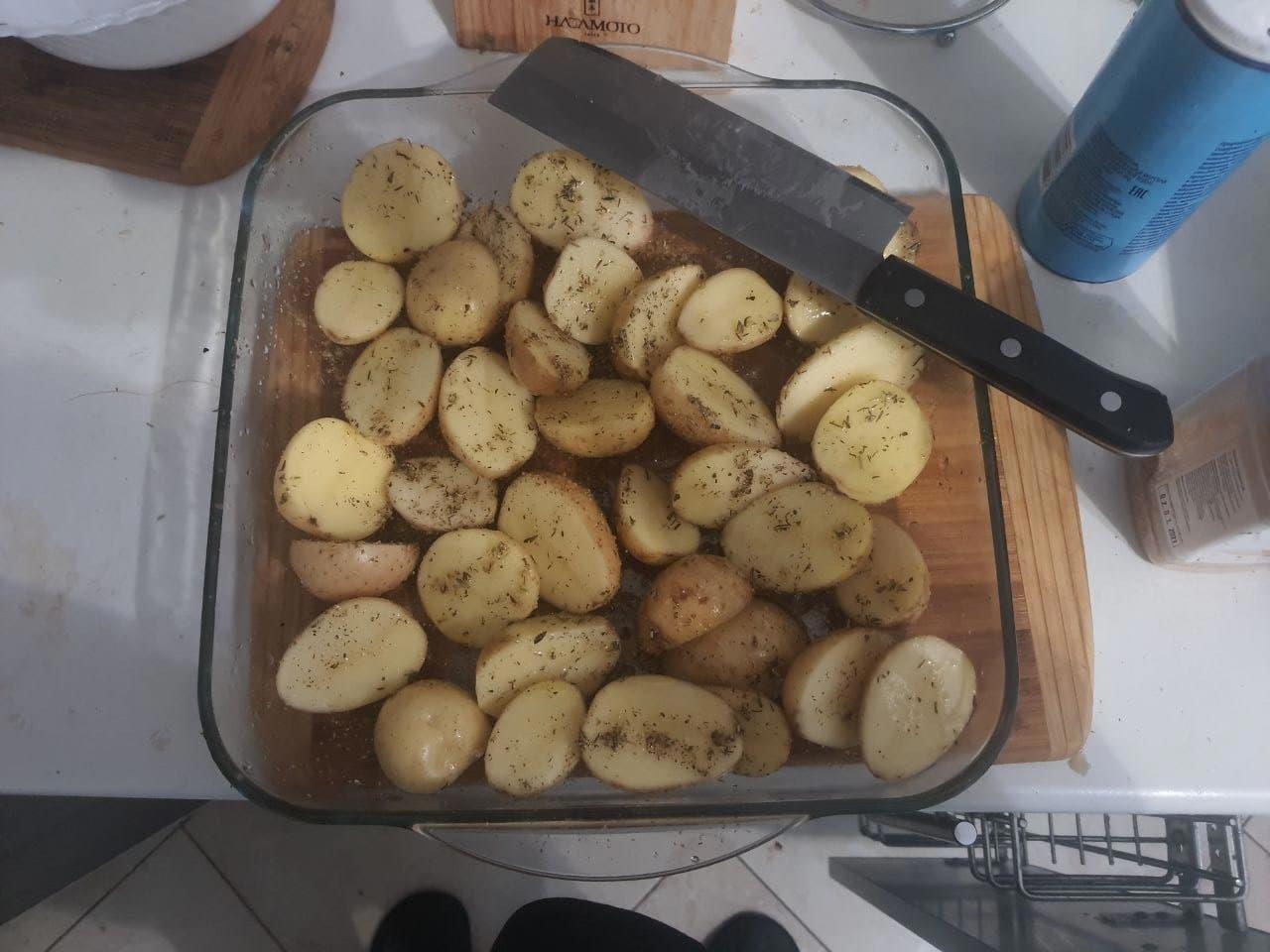 Я взял где-то кило мелкой молодой картошки. Ее не надо чистить. Разрезаете картошку на половинки, посыпаете солью, прованскими травами, сушеным чесноком. И поливаете оливковым маслом.