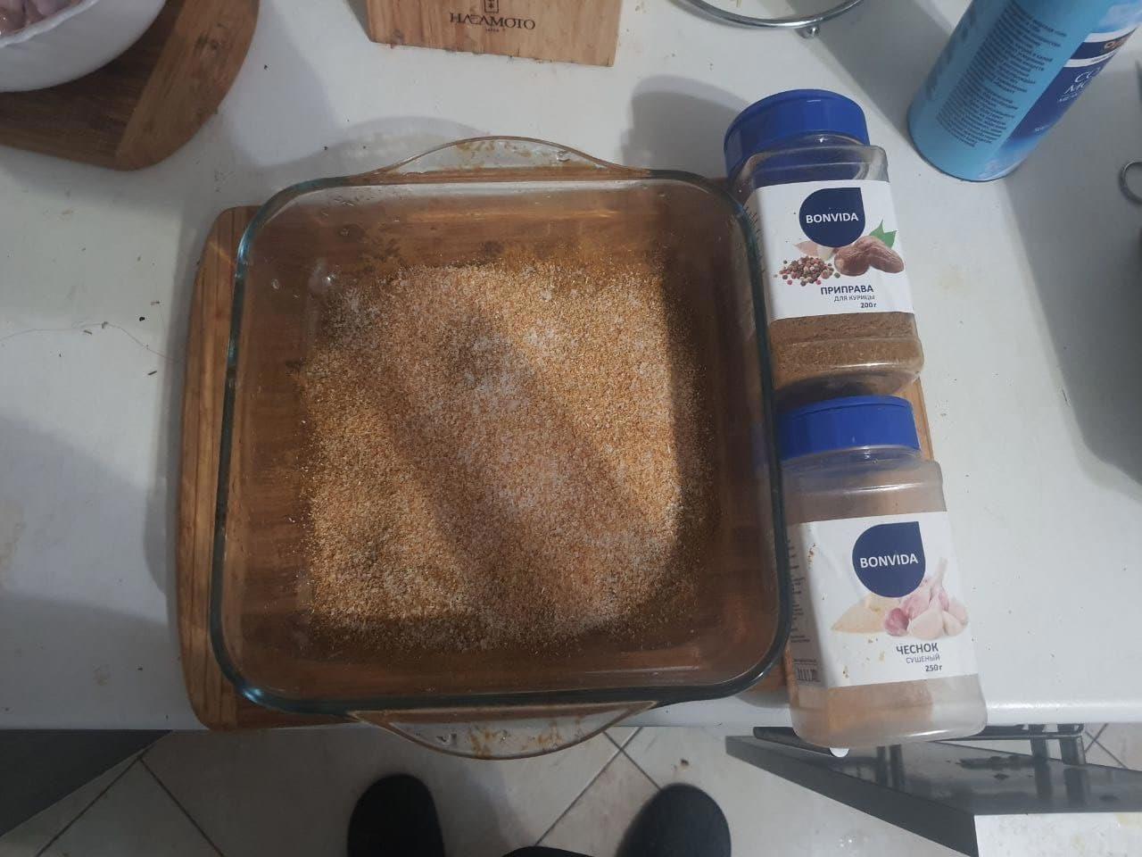Теперь надо сделать панировку. Я беру сушеный чеснок, смесь травок всяких и высыпаю их просто дохрена, толстым слоем. Туда же бахнуть немного соли.