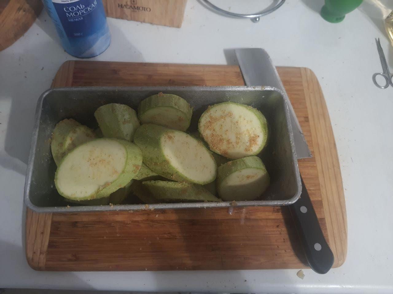 Дальше берем кабачки, и готовим их так же, как картошку. То есть сушеный чеснок, масло, соль, сушеные травы.