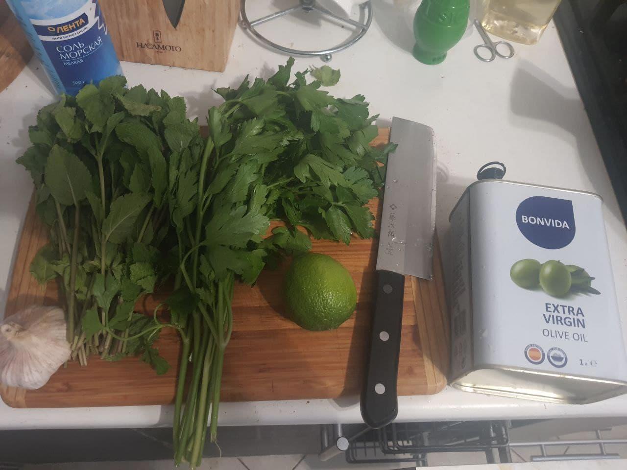 С мяты срываете листья, от петрушки срезаете толстые стебли. С лайма стесать всю цедру, с помощью мелкой терки. В чашу блендера зелень, треть головки чеснока, цедру лайма, сок половины лайма и масло. Взбиваете.
