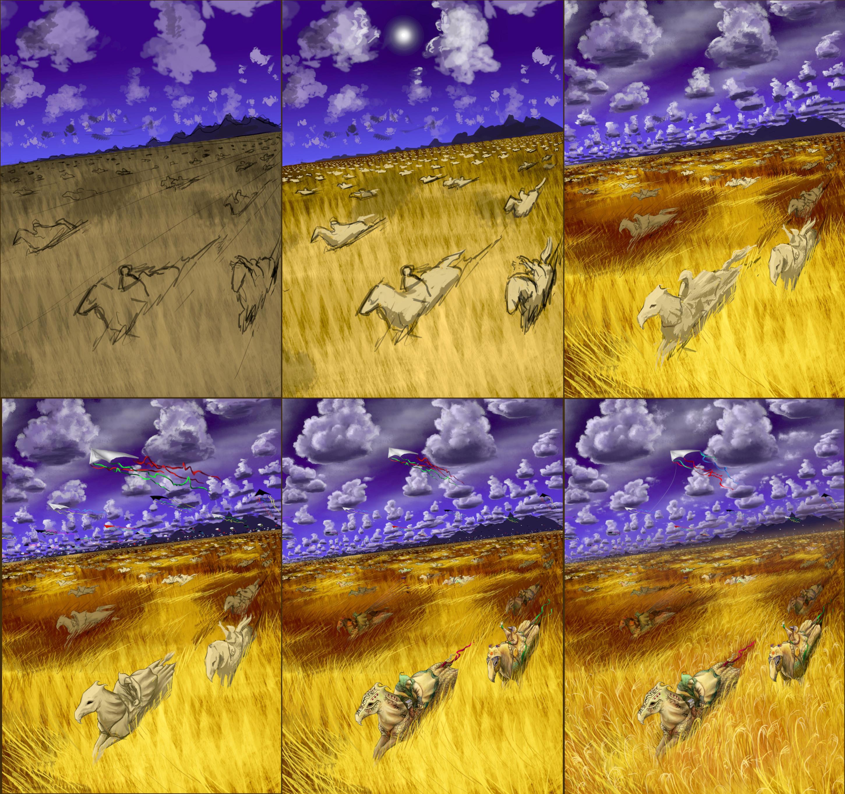 В общем, даю рисунку "созреть". Хожу, делаю другие дела, иногда открываю, смотрю на него, отмечаю в текстовом файлике-списке, что нужно доделать, переделать, добавить, убрать. Заставить себя это сделать уже неимоверно трудно, но понимаешь -- надо. Эти мелочи обычно и решают, заиграет картинка или полностью развалится и станет нагромождением бесполезно-бессвязных элементов. Процесс неприятный, скучный и мучительный. Вдохновленный полет на крыльях видения давно закончился, и уже не веришь, что он когда-то был.