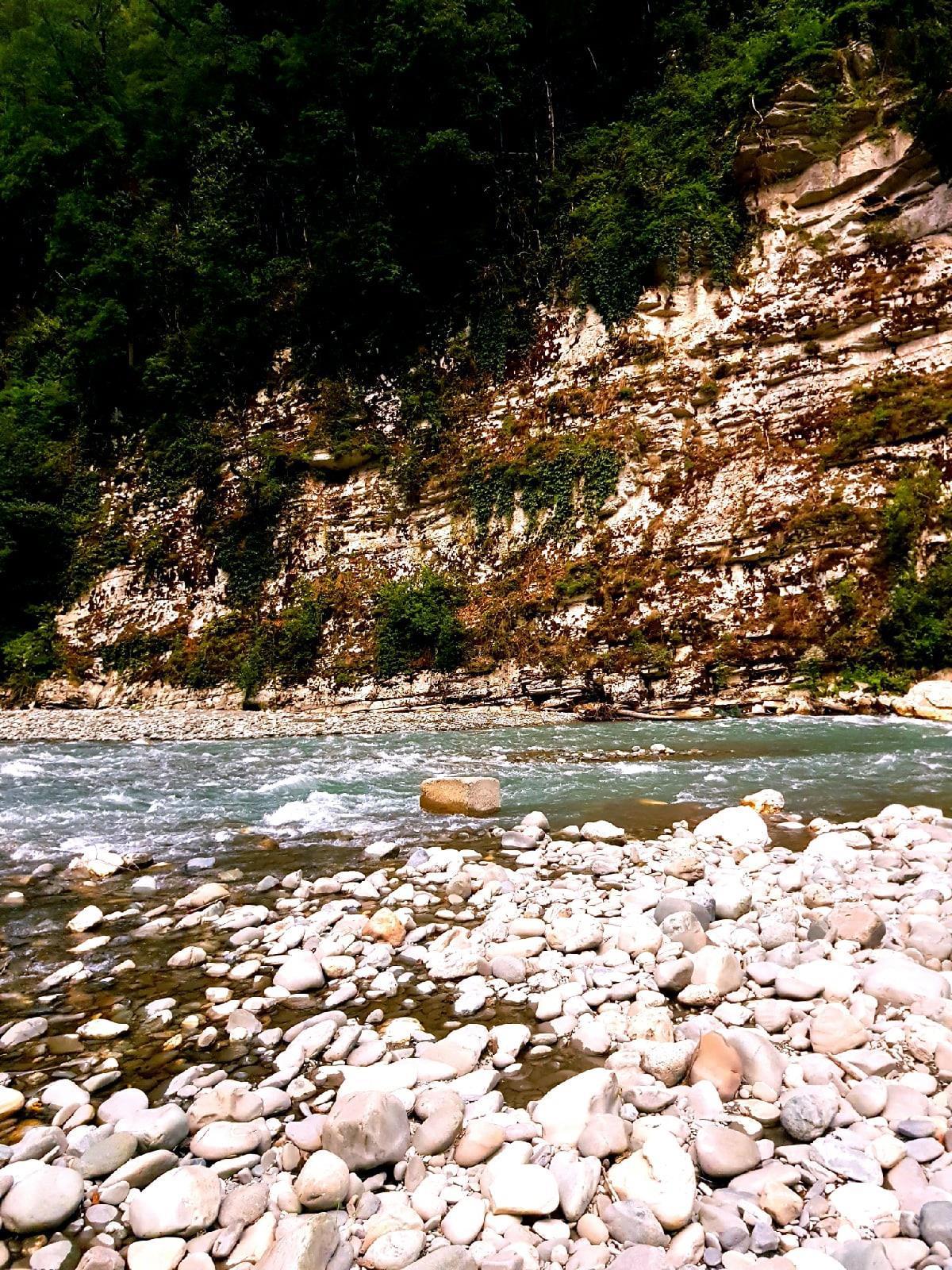 Дорога до озера — тоже не менее живописна, чем до Красной поляны. Вот здесь уже начиналась настоящая дикая природа, между каньонами невероятной высоты, что аж страшно.