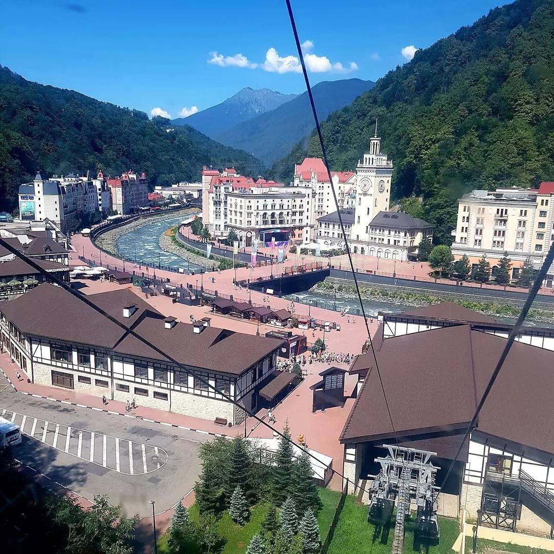Въезжая в Розу Хутор — въезжаешь в маленькую Европу 19 века, хоть я её знаю тоже лишь по картинкам. Только русские названия выдают принадлежность к России. Очаровательные домики, родом из Германии, Австрии и альпийских шале уютно расположились по берегам реки, в окружении гор — суровых стражников, молчаливо охраняющих сказочное европейское великолепие, островок, где время застыло, и ценам бы не мешало застыть (если на вершине горы захотите поесть — сосиска в тесте обойдётся в 200 сука рублей