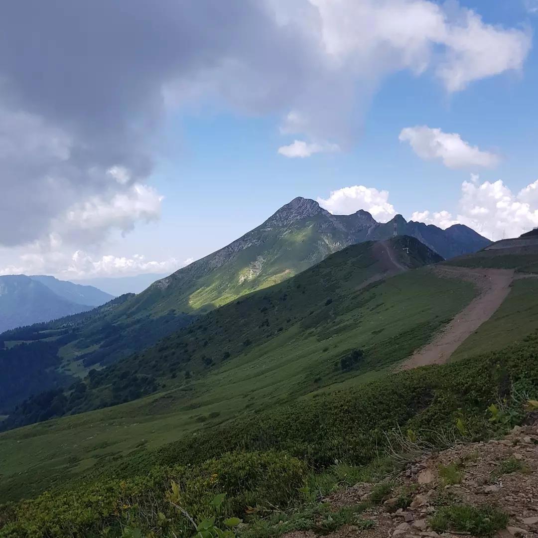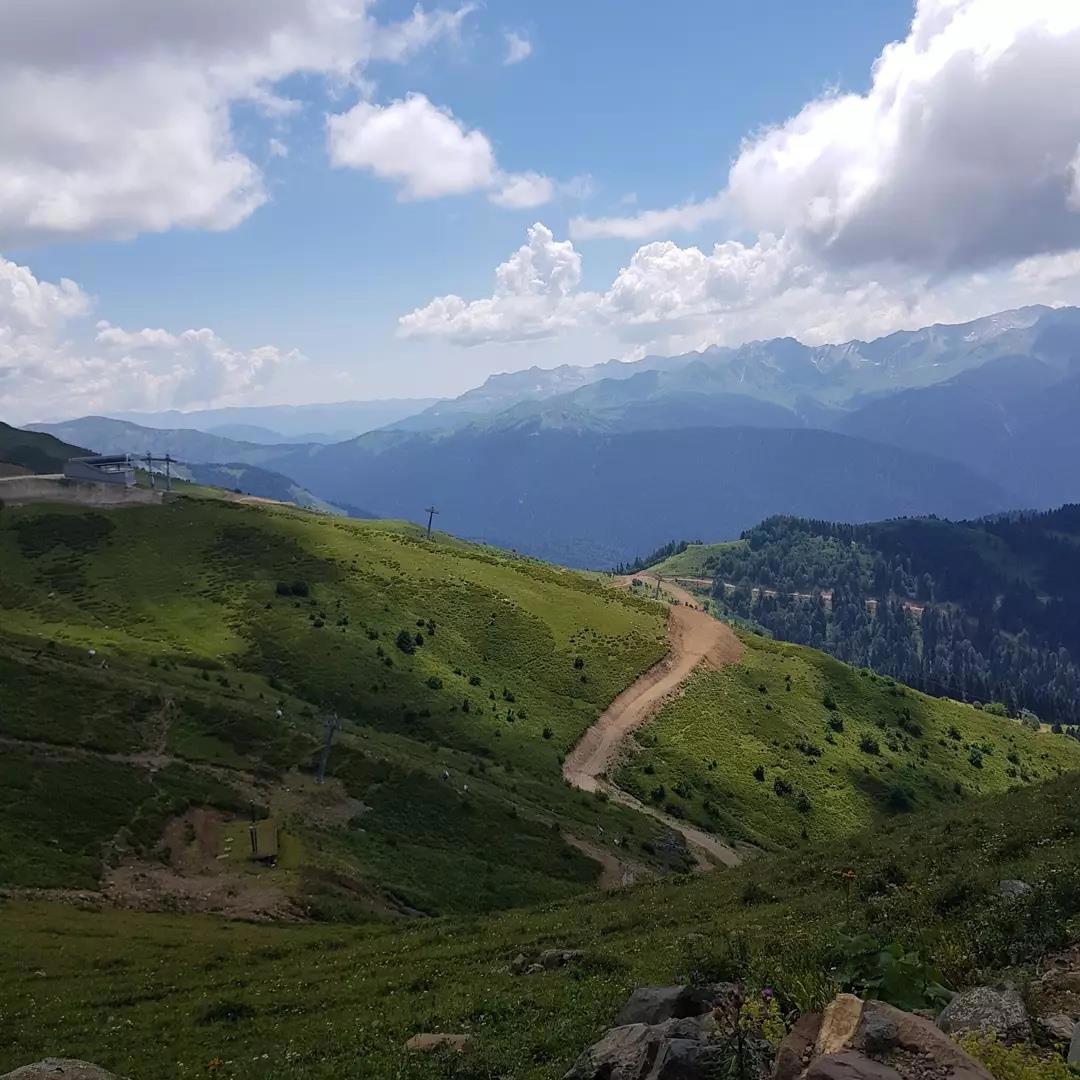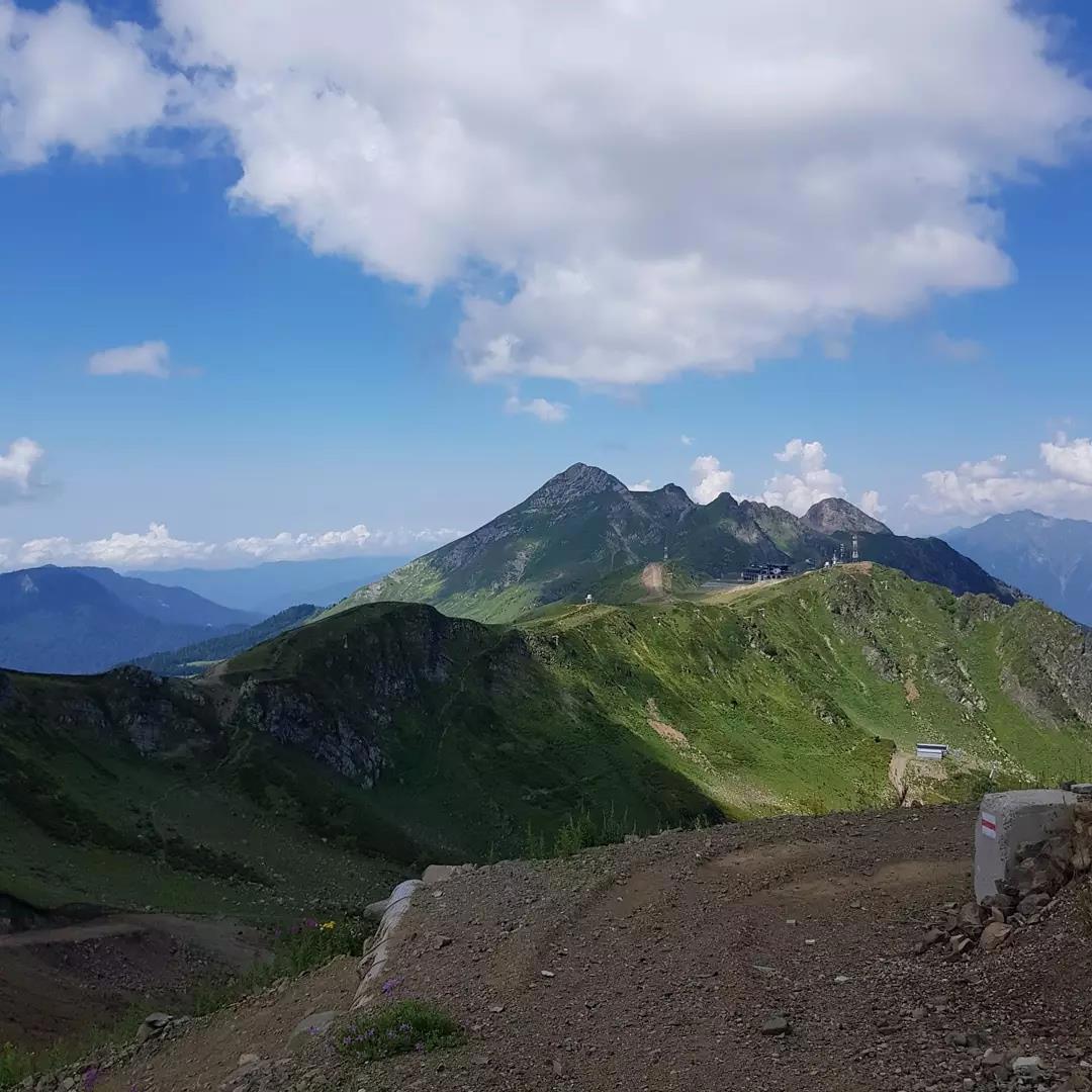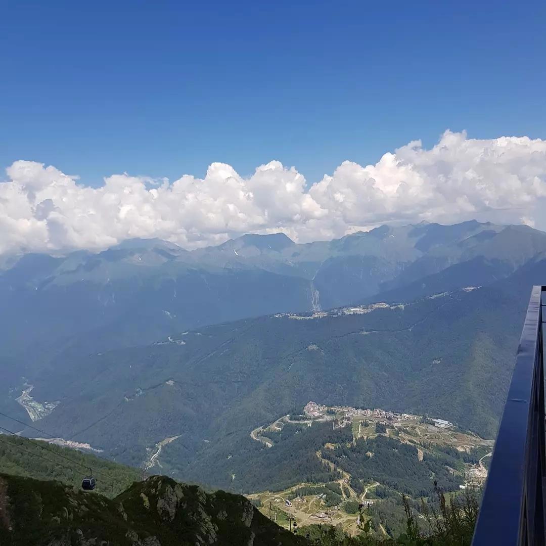 Побывать на Розе Хутор и не подняться по канатной дороге — преступление. Поэтому мы первым делом купили билеты и отправились наверх. Знаете, у меня было ощущение при подъёме, что я умерла и моя душа возносится в рай. Советую прокатиться на открытом фуникулере: обзор лучше и чувство невесомости острее.