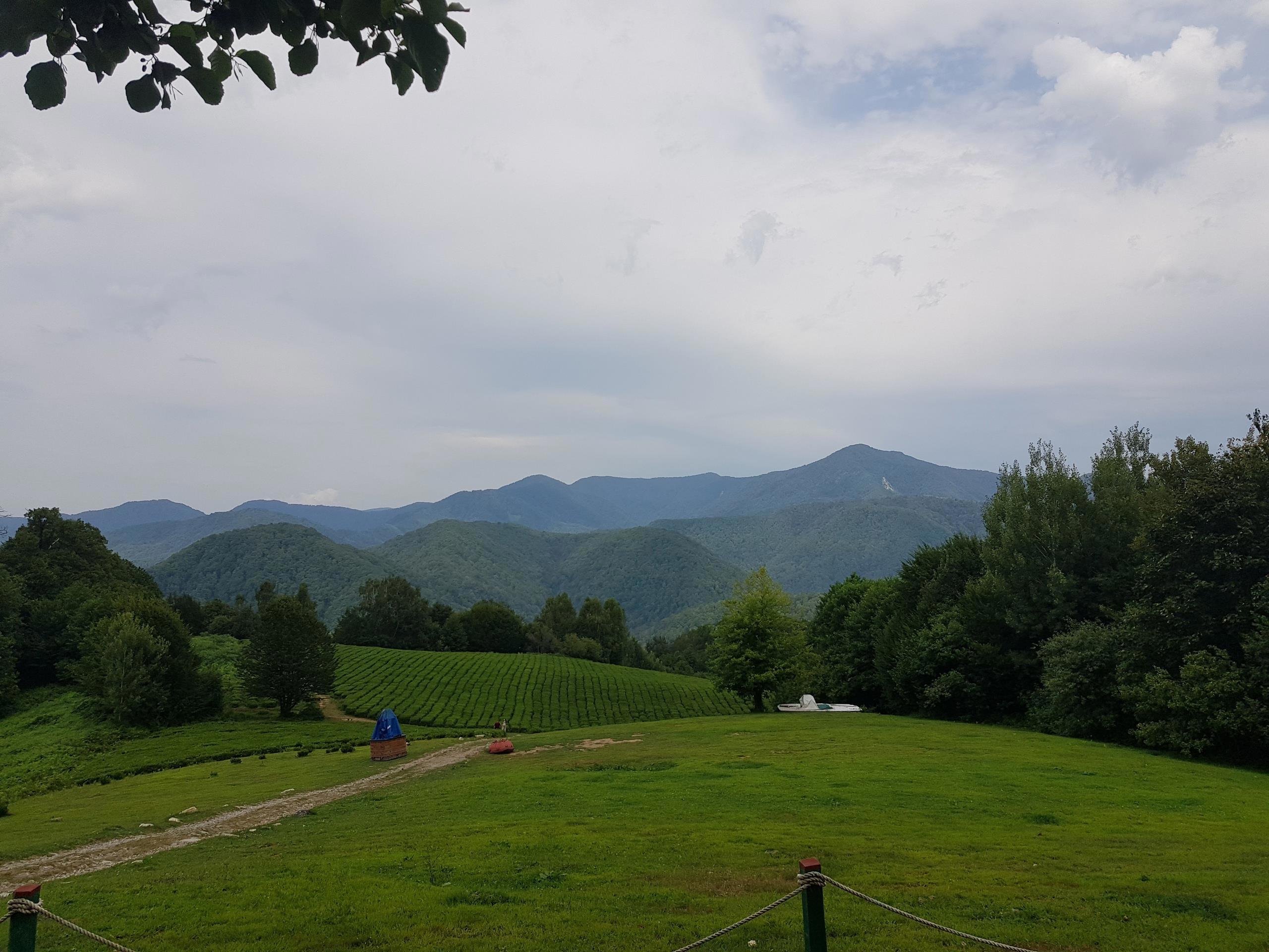 На 7 августа для юбилея своей половинки я приготовила кое-что особенное. Правда, до туда пришлось добираться километров 70 от места пребывания, чего я заранее учесть не смогла. Сначала дорога была обычной дорогой, а потом хоба! и закончилась, мы познали, что такое настоящий грунтовый серпантин. С низкой подвеской было тяжко, я прямо осязала негодование мужа и машины. Однако добрались до Солохаул-парка благополучно, без происшествий. Теперь настал волнительный момент. Трясущимся голосом объявила половинке, что сюрприз — полёт на воздушном шаре. Я ожидала всего угодно, но только не этого. Он заявил, что боится высоты и никуда не полетит. Признаться, я охренела и сильно расстроилась. После небольшой инсценированной моими личностями истерики, муж предложил подняться на гелиевом шаре. Тот поднимается автоматически, практически без участия человека, что его малость успокоило. Перед тем как подняться, вчетвером прогулялись по парку: парк небольшой, главная достопримечательность — чайная плантация и шикарный вид на горы.