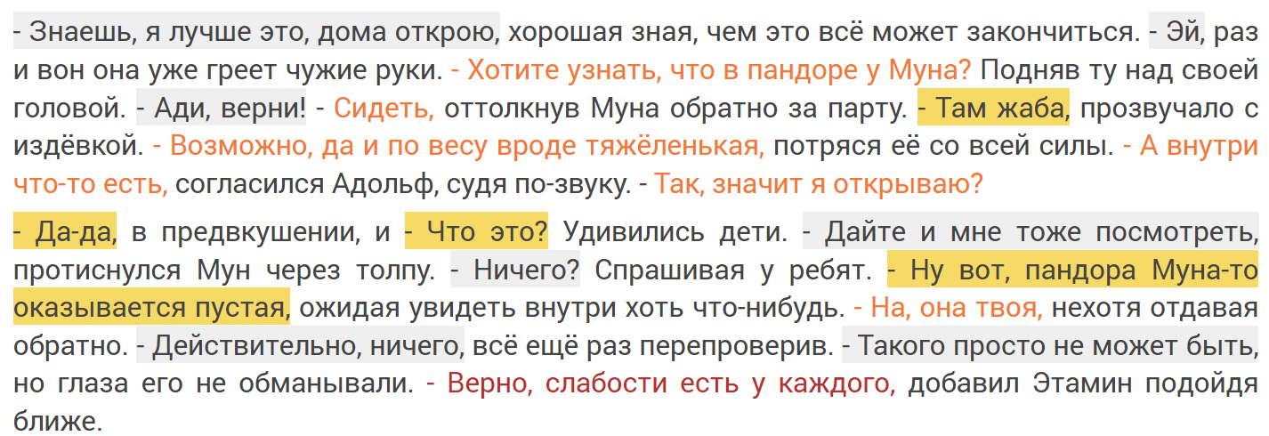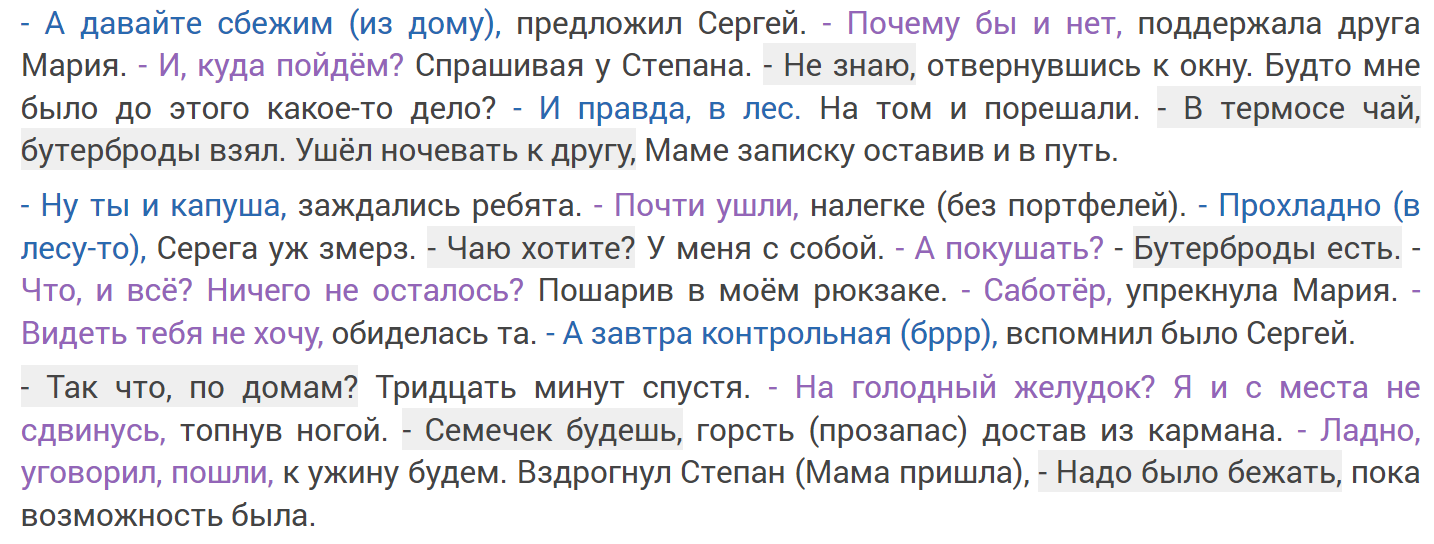 Автор: Евгений СанжаровНекоторые авторы (типо меня) любят концентрироваться чисто на диалогах между персонажами, уделяя повествованию лишь пару слов (и то вскользь). Отсюда и (растут ноги) непонимания читателя, кто с кем сейчас ведёт диалог, когда главных лиц становится больше двух. Например пять или семь за раз, и тут уже столь полюбившееся многими авторами "сказал Петя" двадцать раз к ряду, уже не выдерживает никакой критики. Но есть и выход, это выделять прямую речь цветом, как на примере ниже (до и после):
