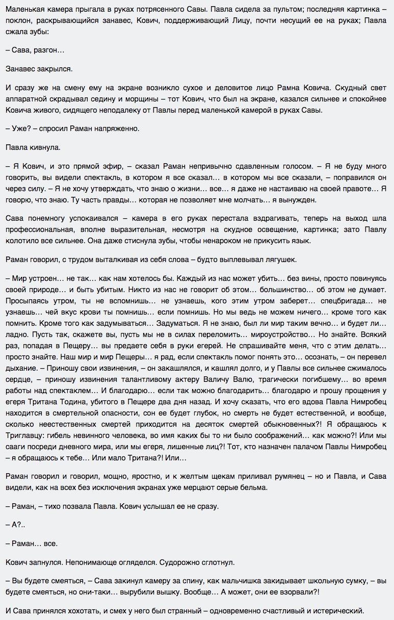 И второе, что до сих пор мне ножом по сердцу, как бывшему ассистенту режиссёра, заставшему ещё бетакамы, — ляп из обожаемой книги "Пещера" Дяченко. Главная героиня занимается ровно тем же, чем занималась я в 2006-2008 годах, и эта тема мне близка чисто профессионально. И вот что там почти в конце книги (дело происходит в эфирном блоке, где вместо новостей тайком выдаётся в эфир запись запрещённого спектакля и последующее интервью режиссёра постановки):
