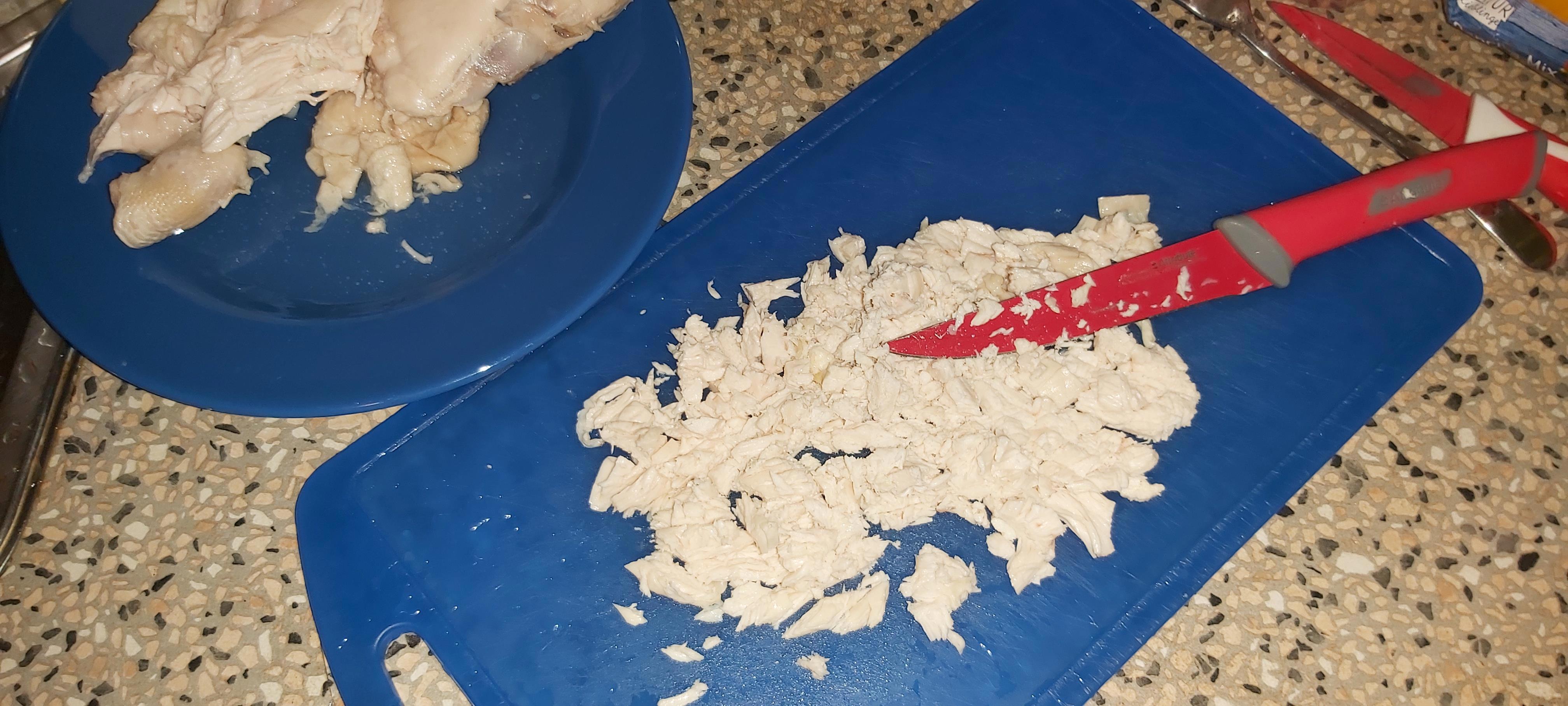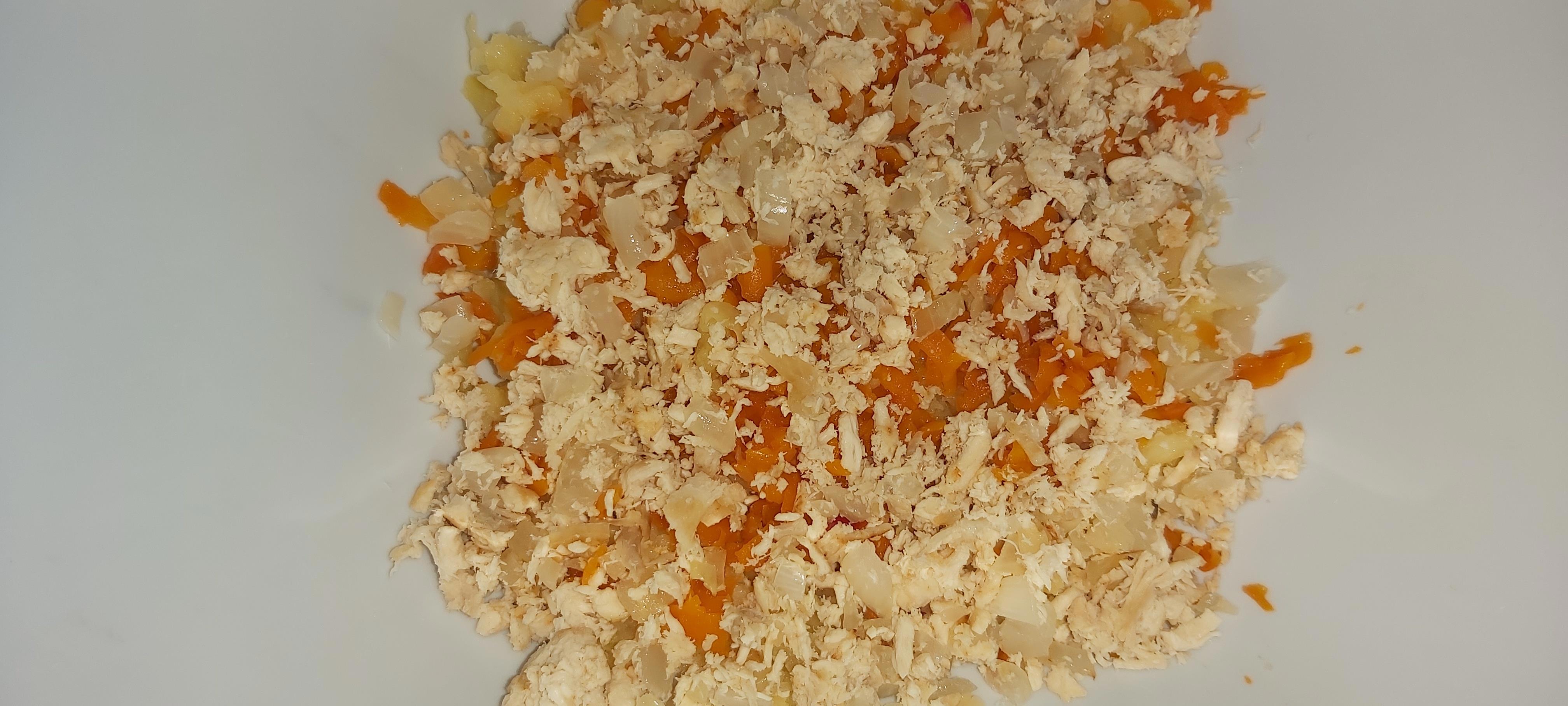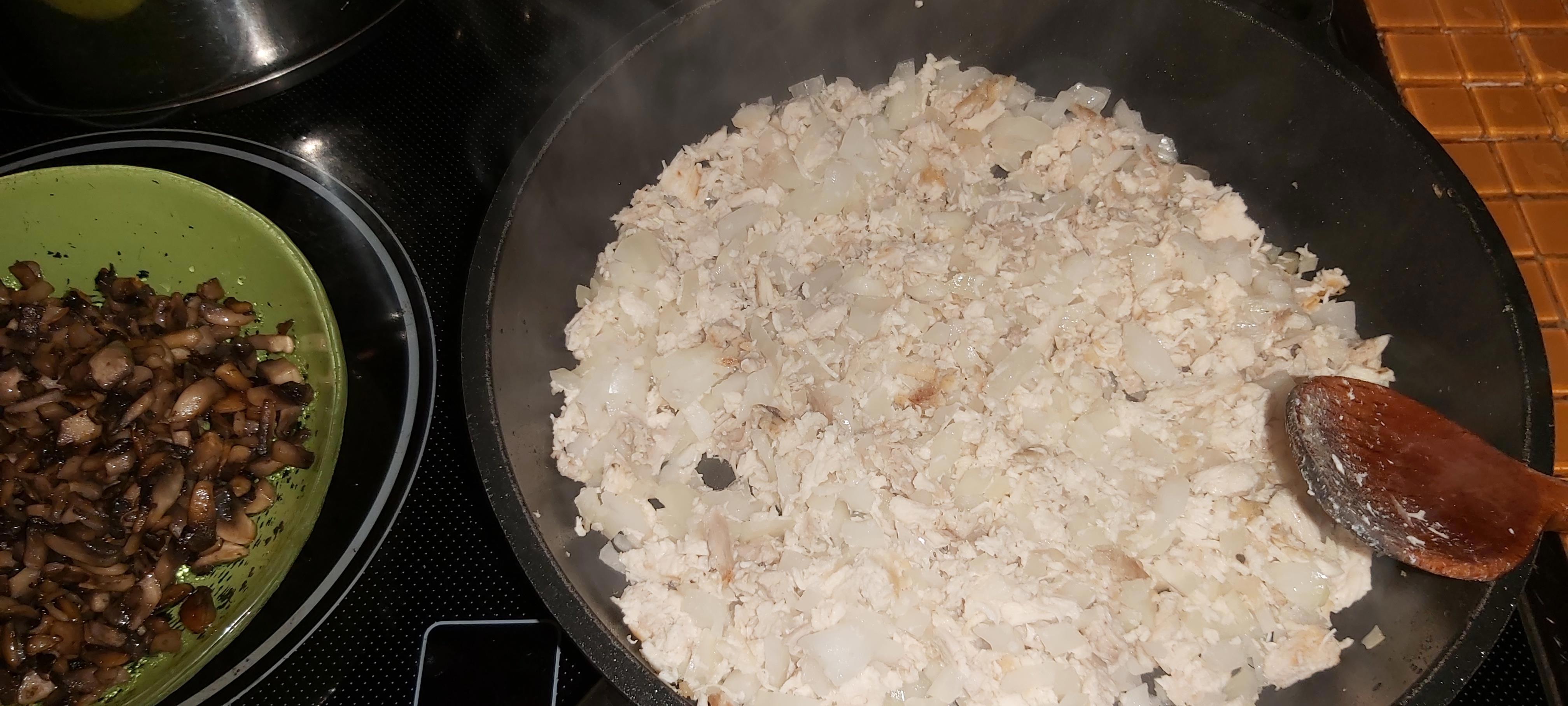 Скинула на тарелку, а потом куру с луком обжарила. Поставила остывать.