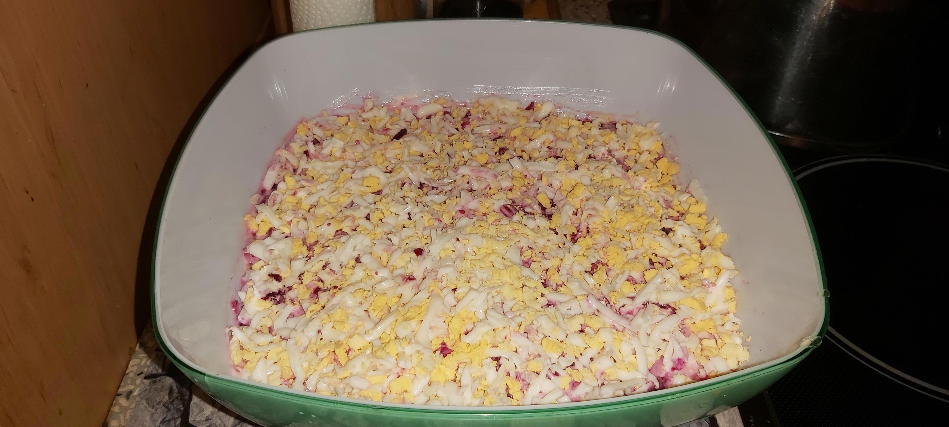 Сначала картоху, потом морковь, куру с луком, свеклу, чесночка немного добавила, картоху, грибы, свеклу, опять куру с лукум, картоху, свеклу (а, не забываем майонезом смазывать) яйцо!