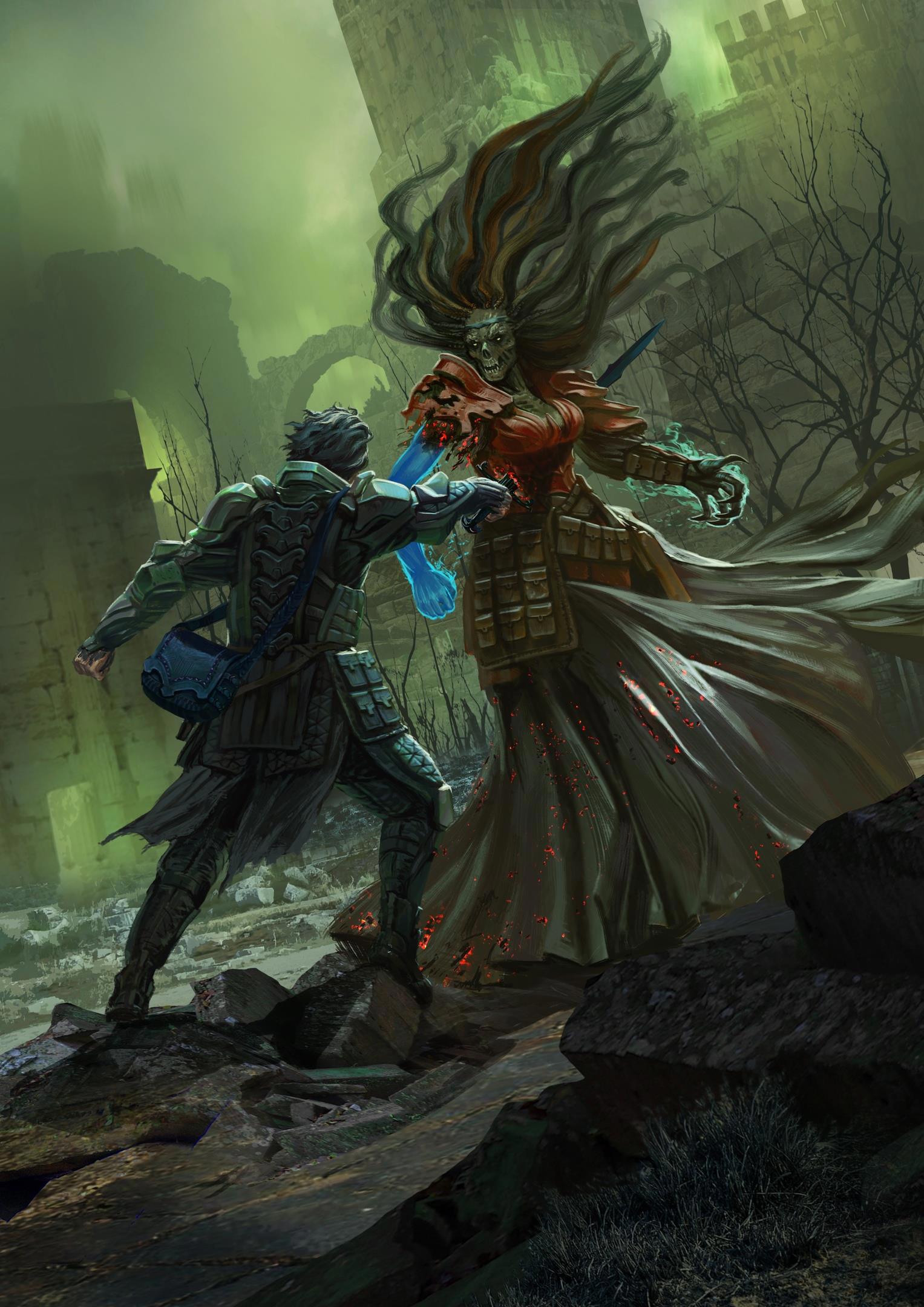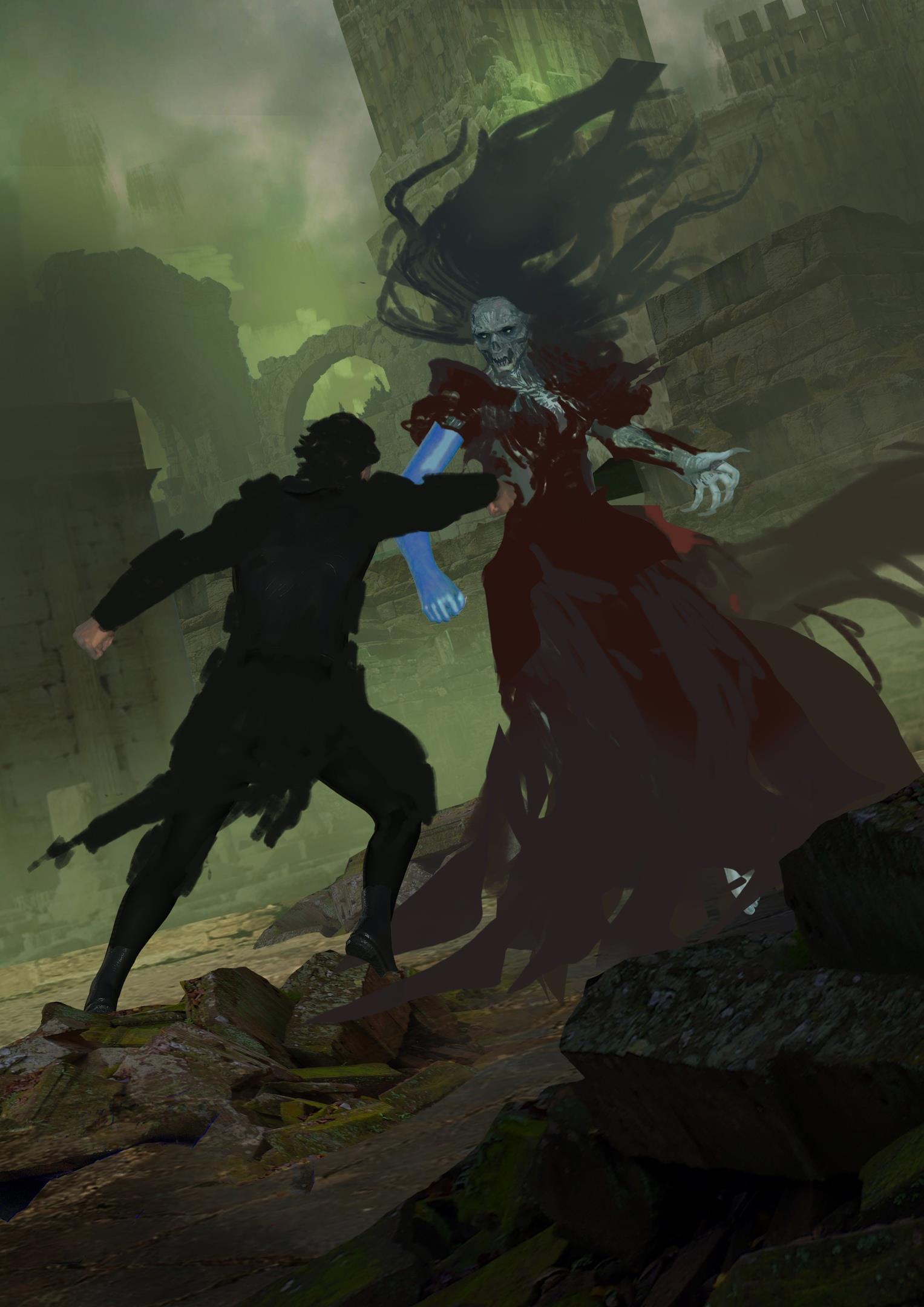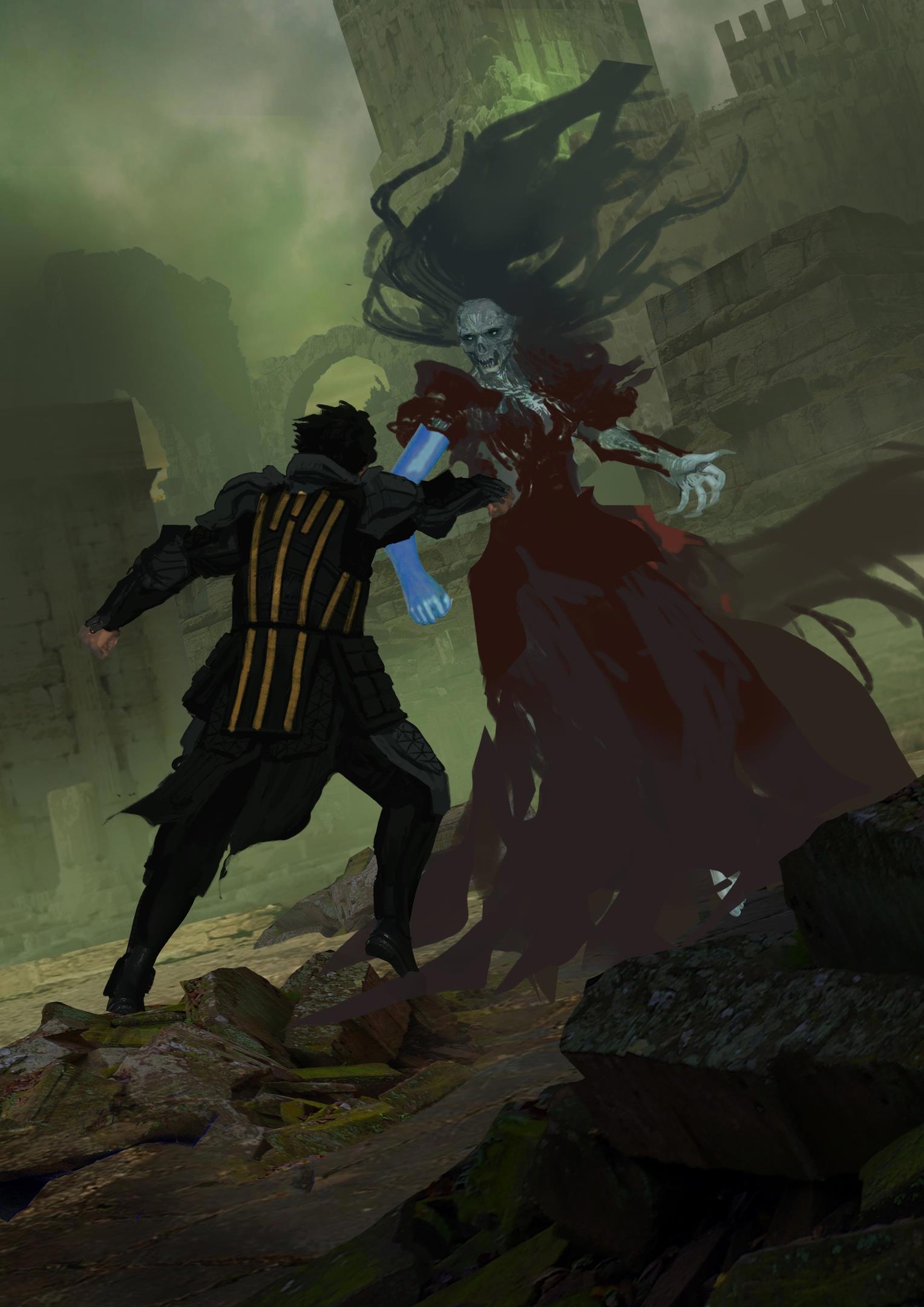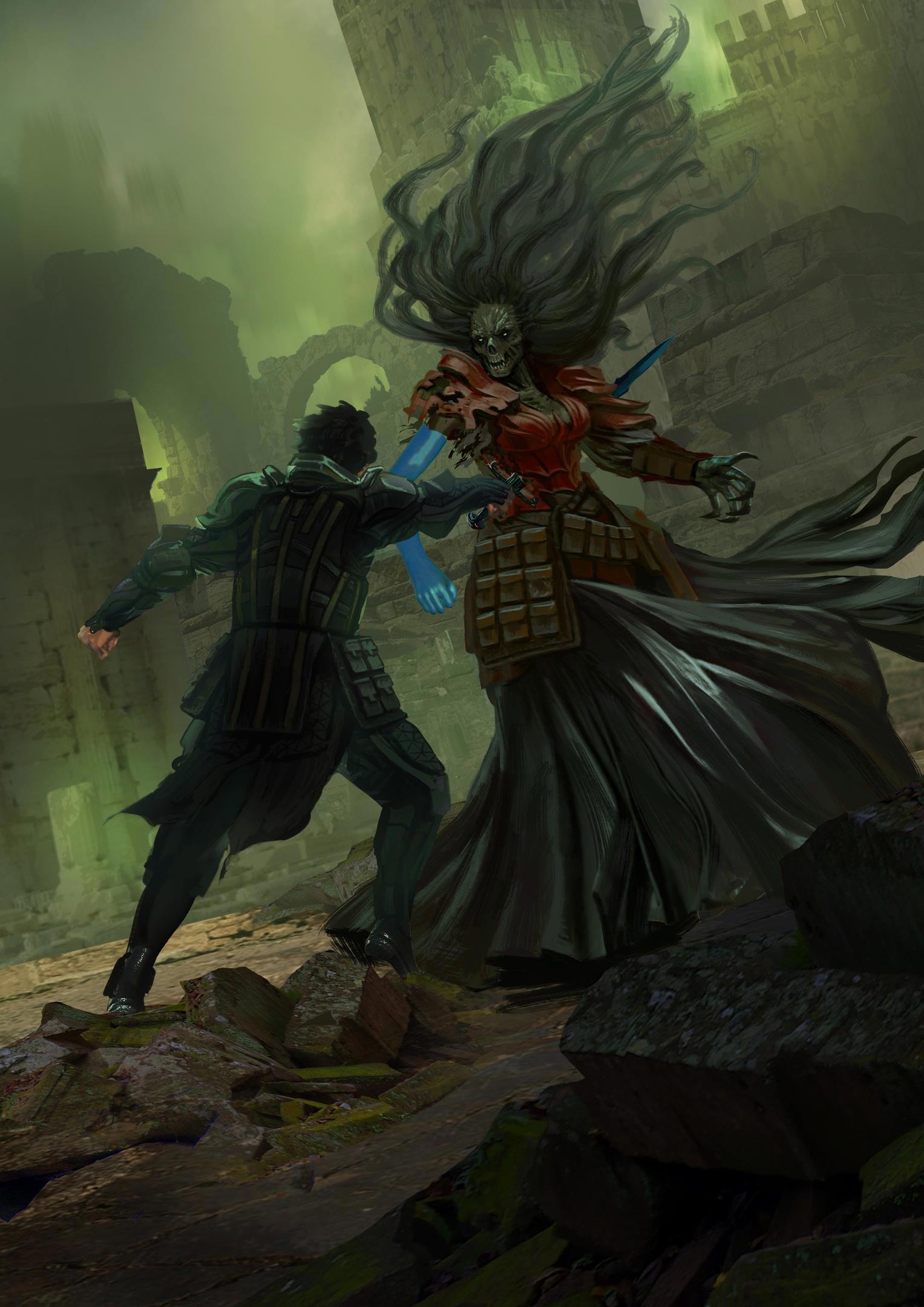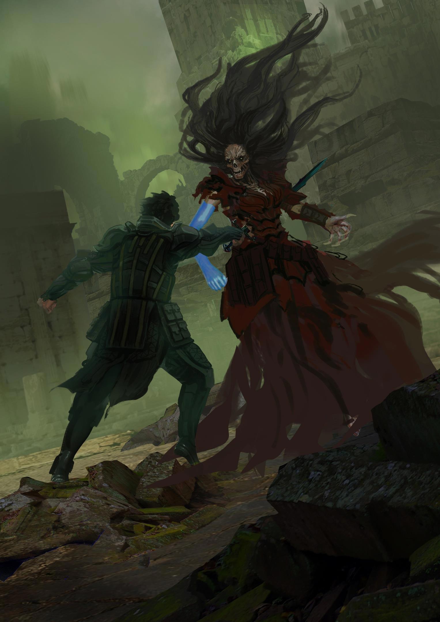 ТЗ на пятый и шестой тома я делал в некоторой спешке - приближался последний день подписки, ускорять сюжетные события я не хотел (пусть пару раз меня в этом и обвиняли), но и с обложками нужно было что-то решать. В общем, именно тогда, еще до завершения книги, я выбрал сцену на обложку. По завершению появилось ещё несколько вариантов, но по композиции они пересекались бы с прошлыми вариантами, так что менять я ничего не стал. И рисовать решили схватку с Хёнгой, одной из личей, охраняющих алтарь Великого Ы. Как и всегда, покажу этапы...