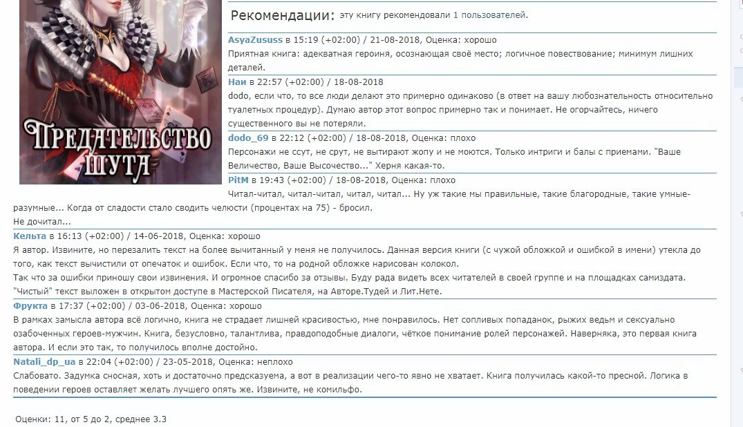 Но основной вывод не в этом. Я просто в очередной раз поняла, что ни одна книга не может нравится всем. И если читатель не нашел в ней то, в чём нуждается, это не вина читателя и не вина автора. Просто история оказалась для другой целевой аудитории, или другого настроения, или другого возраста. А даже возмущённым читателям я благодарна и за их внимание к "Шуту", и за то, что они нашли в себе силы написать честный отзыв.