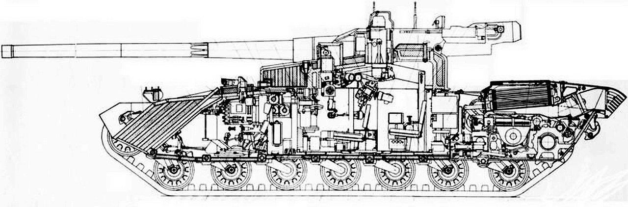 Попытки создать принципиально новый танк были временно завершены в связи с развалом СССР в конце 80-х, начале 90-х годов. На этот момент самыми широкими исследованиями, дошедшими до какого-то логического завершения, были машины известные, как объект 477 «Боксёр» и его продолжение объект 477 же, но «Молот». Вот схема одного из многочисленных вариантов компоновки этой машины: