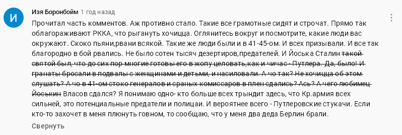 Волосы дыбом встают от тех, кто с удовольствием жрет пропаганду Сороса, михалковщину, негативные мифы о Рабоче-Крестьянской Красной Армии и просит добавки, а потом выдает такие комментарии: