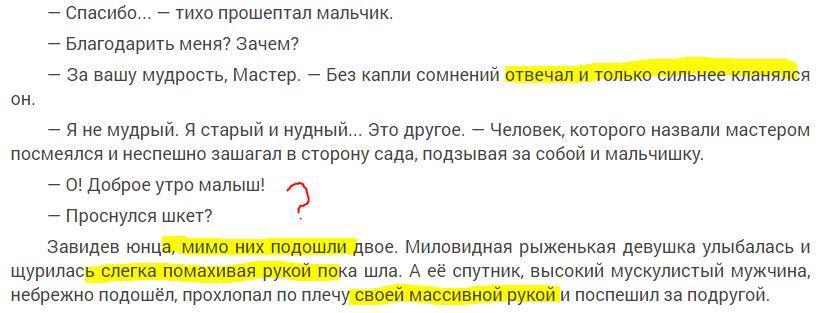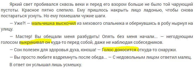 А ещё предложения изобилуют многоточиями… Вероятно, это такой способ добавить загадки в текст… Но я считаю, что в художественной литературе, особенно в фэнтези и приключенческой, нужна чёткость формулировок и ясность образов, а многоточия за пределами прямой речи почти не должны употребляться. Всего должно быть в меру, а здесь их чересчур много на квадратный абзац текста.