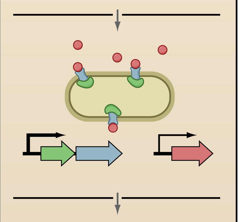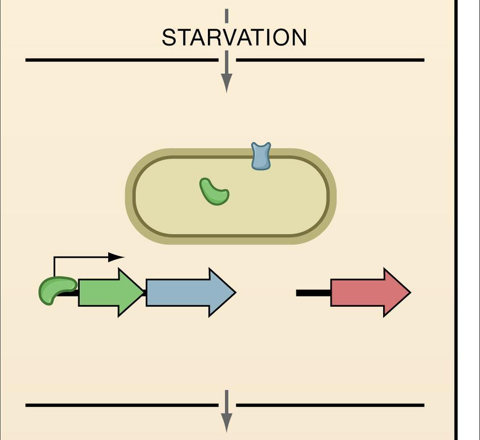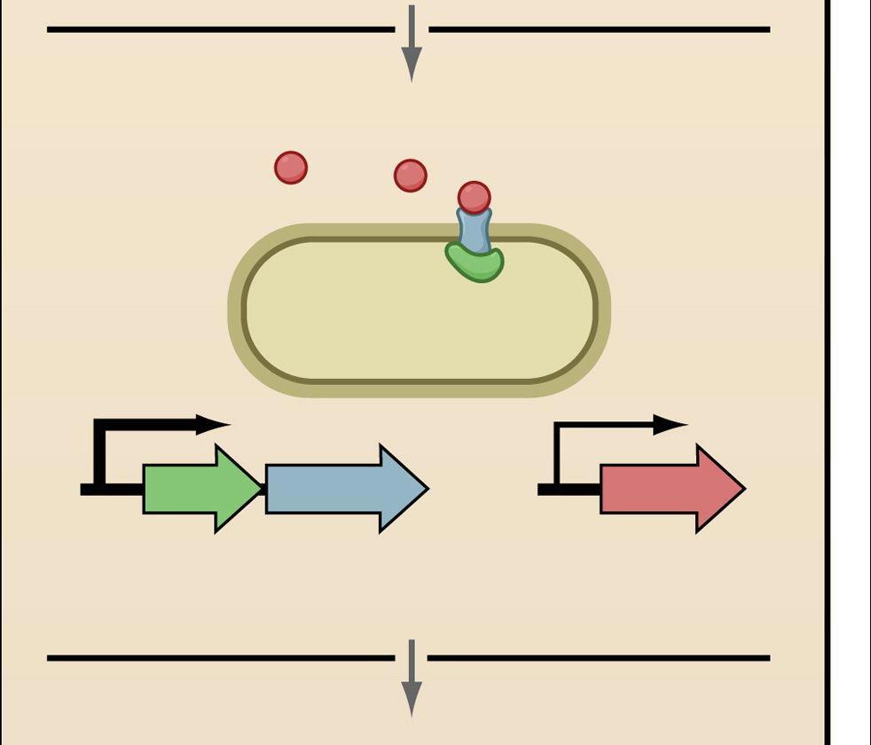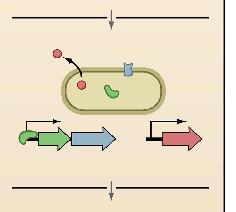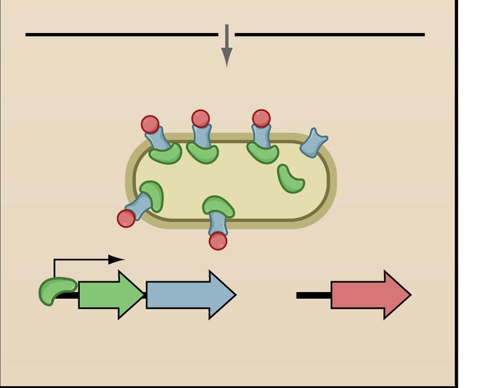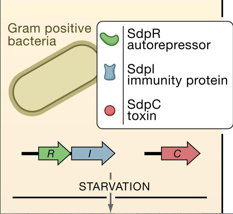 В нормальных условиях защитных белков SdpI (показаны серым цветом) немного. Их синтез блокируется белком SdpR (показан зелёным цветом). Но вот в окружающей среде не стало питательных веществ. Запустился ген-регулятор Spo0A. Бацилла выработала токсин SdpC (показан красным цветом) и вытолкнула его за пределы своей мембраны.