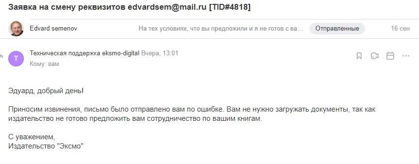 Рассказываю! Пару недель назад приходит мне на мыло из технического отдела Эксмо-Диджитал письмо, что "ваши паспортные данные не читаются, пришлите заново". Захожу в свой аккаунт на Эксмо-Диджител. (Что это такое, многое писалось на АТ, если кто не знает, погуглите). Проверяю. Вроде все нормально. Два моих романа там прошли проверку, но как написано в статусе "...требуют доработки". (ИздЕВательство просит денег за корректуру, изготовление обложки или аудиоверсию). Пока думаю... На всякий случай делаю запрос на смену реквизитов. И даже забываю об этом. Пару дней назад приходит письмо из Эксмо с вопросом: "Зачем вы просите смену реквизитов?". Пишу в ответе, что на всякий случай, так как вы сами просили.