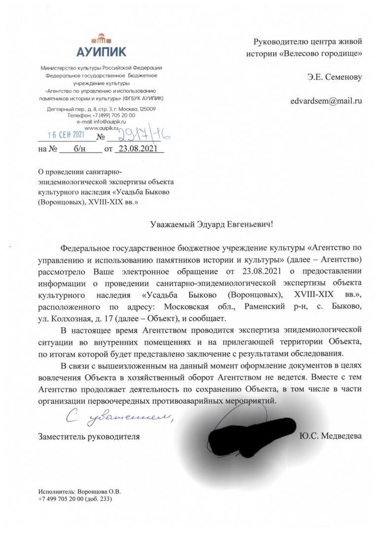 И вот последнее письмо.... Тут нужна небольшая предыстория. В СССР в усадьбе был туберкулезный санаторий. И Роспотребнадзор (На самом деле непонятно кто, так как нет никаких бумаг, кроме заявлений в СМИ иногда от тех же чиновников) считает, что в помещениях может остаться вирус (тут меня поправляют, на самом деле - бактерия. Ну, я лузер. Вы поняли?) туберкулеза, а это опасно для жизни, и поэтому в зданиях нельзя ничего проводить без экспертизы и санобработки. Поэтому собственно усадьба и разрушается...