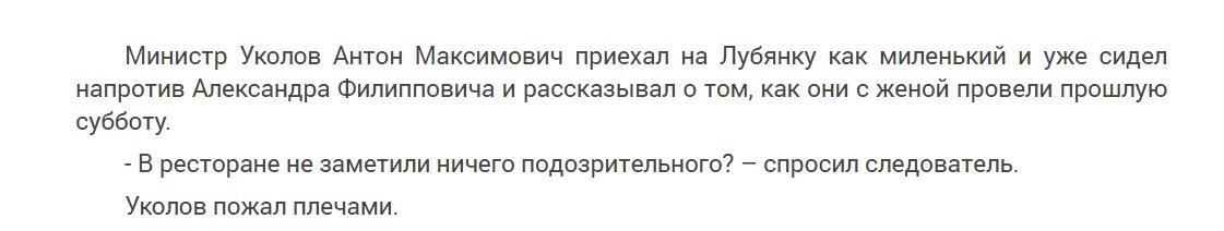 "Артём скосил глаза. Увидел, что в церкви появились его отец и мать. (...) Папаня вырядился согласно дресс-коду "блэк-тай"... А мама, Елена Анатольевна, выглядит вдохновленной действом (...)"