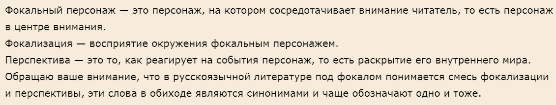 P.S. Не хотела здесь касаться извечного спора о том, что такое "фокал", "точка зрения", "фокальный персонаж" и т.д., но народ желает ясности).