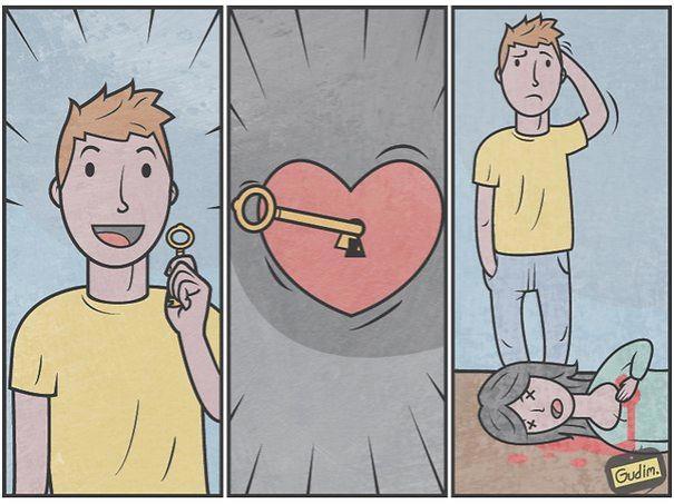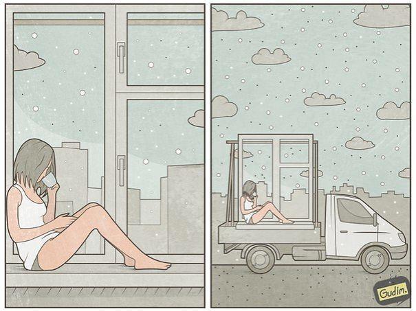 Жизнь – забавная и беспощадная штука, как подмечает московский художник Антон Гудим (Anton Gudim). Антон Гудим стал известен благодаря мини-комиксам, в которых препарирует повседневную реальность, парадоксально обыгрывая бытовые ситуации. Характерная черта его работ – неожиданный поворот сюжета. Многие из его произведений стали вирусными в Интернете, а на некоторые придётся посмотреть дважды, чтобы понять задумку автора. Иллюстрации Гудима смешные, саркастичные и прямолинейные. Художник, который своим творчеством проник в душу и ущипнул за живое пользователей социальных сетей. Совсем недавно количество подписчиков Антона в Instagram перешло отметку в 100 тысяч!
