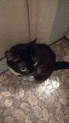 Перед вами некрупная чёрно-белая кошечка по имени Ася. Она сидит у двери в ванной.
