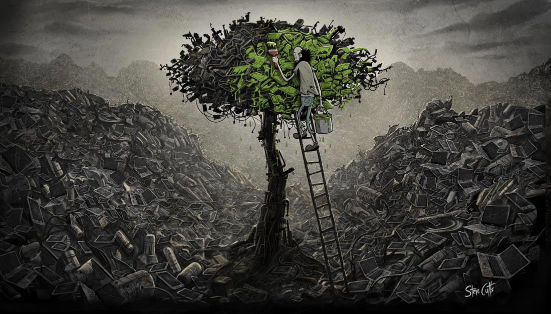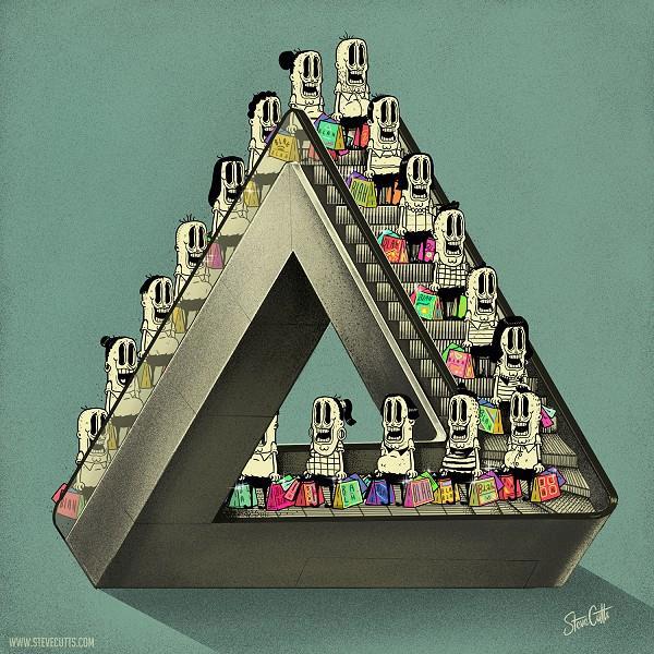 Искусство – это не только сказочные фотосессии и медитативные пейзажи, но и катализатор перемен. Такого мнения придерживается лондонский иллюстратор и аниматор. Каттс уверен, что работа не должна становиться мучением, жизнь нельзя превращать в крысиные бега за всемогущим долларом, а потребительство не должно руководить обществом. Художник говорит, что безумие человечества это бесконечный источник вдохновения.