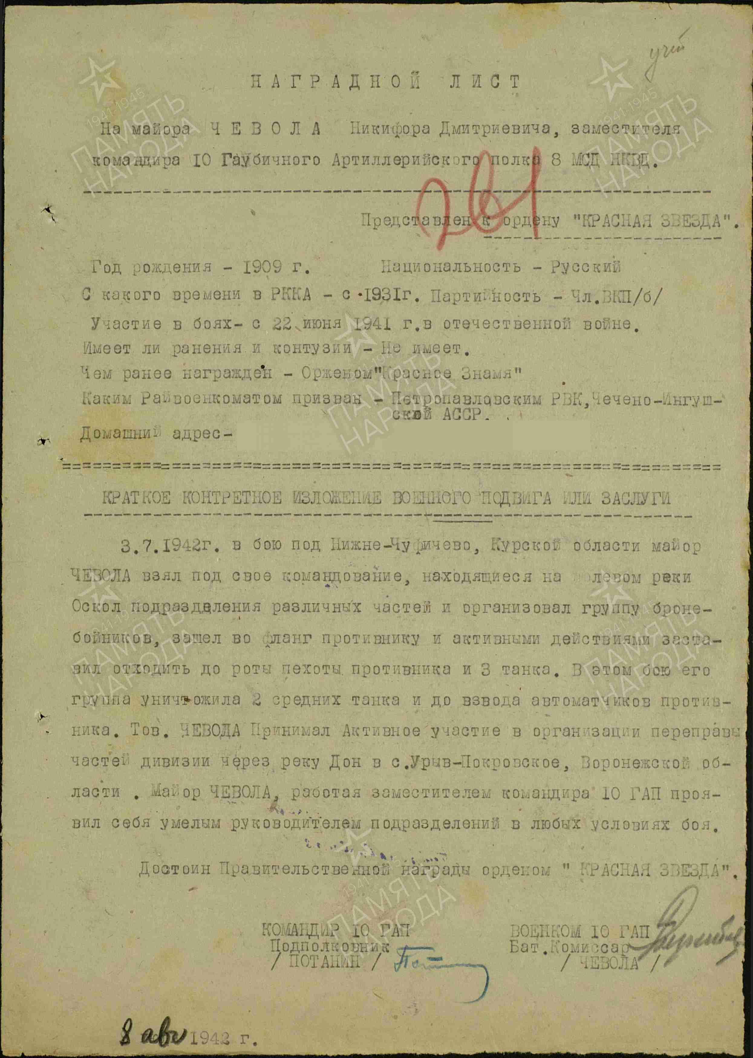 Между тем, 27 октября 1942 года Военный Совет 21 армии Донского фронта выпустил приказ о награждении бойцов и командиров медалями "за отвагу" и "за боевые заслуги". В числе 75 человек, получивших первую медаль, был и майор Чевола.