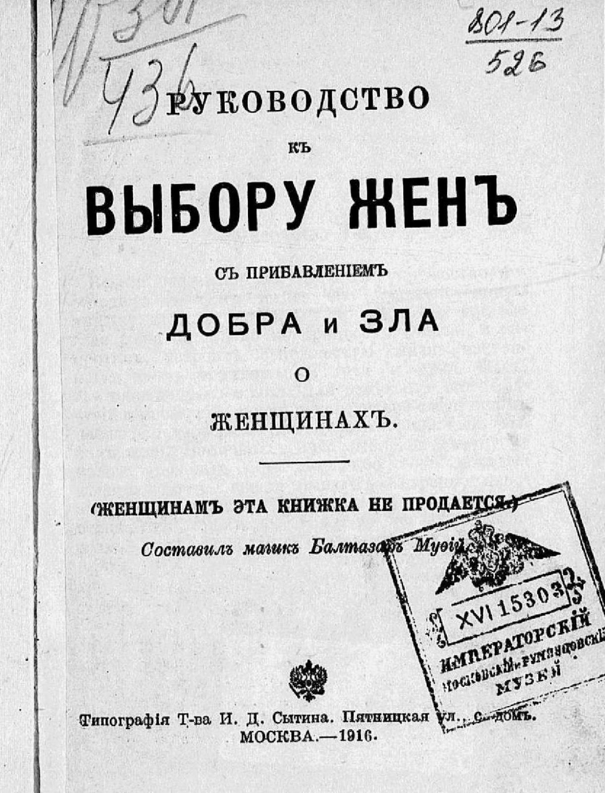 Руководство к выбору жен с прибавлением добра и зла о женщинах. (Женщинам эта книжка не продается).