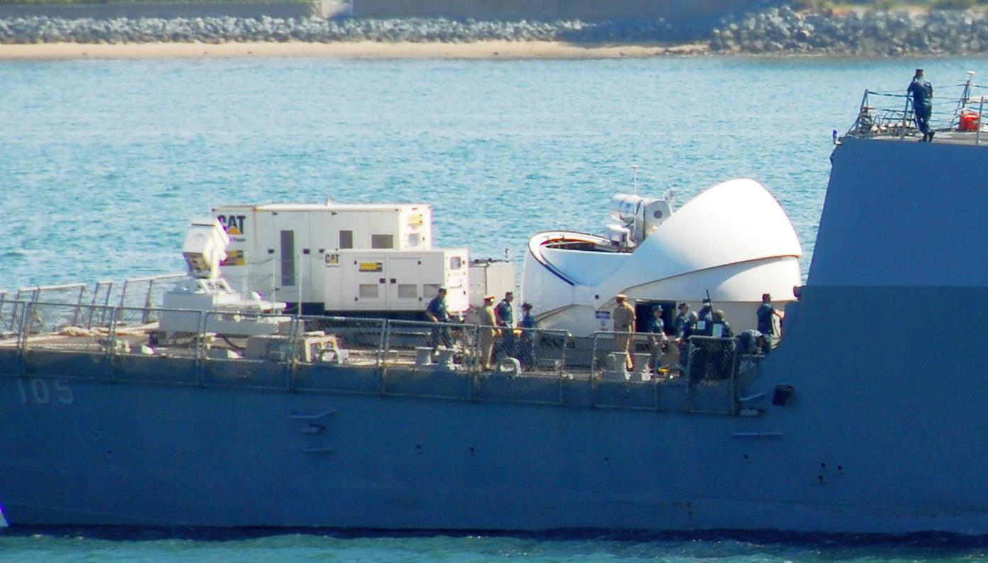 Американский флот тоже не остался в стороне от подобных экспериментов. Даже больше – он вообще впереди всей этой программы, так как американцы не без оснований считают, что именно флот будет первым «потребителем» подобного оружия – ведь именно на кораблях проще всего обеспечить энергетику для лазера. Одним из первых кораблей, на которые американцы установили свой прототип боевого лазера системы TLS был эсминец DDG-105 «Дьюи» (типа «Арли Бёрг»). Это произошло в 2012 году. Вот тот самый эсминец с тем самым лазером (там на корме, на вертолётной площадке):