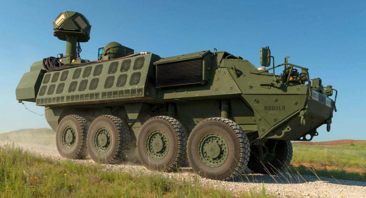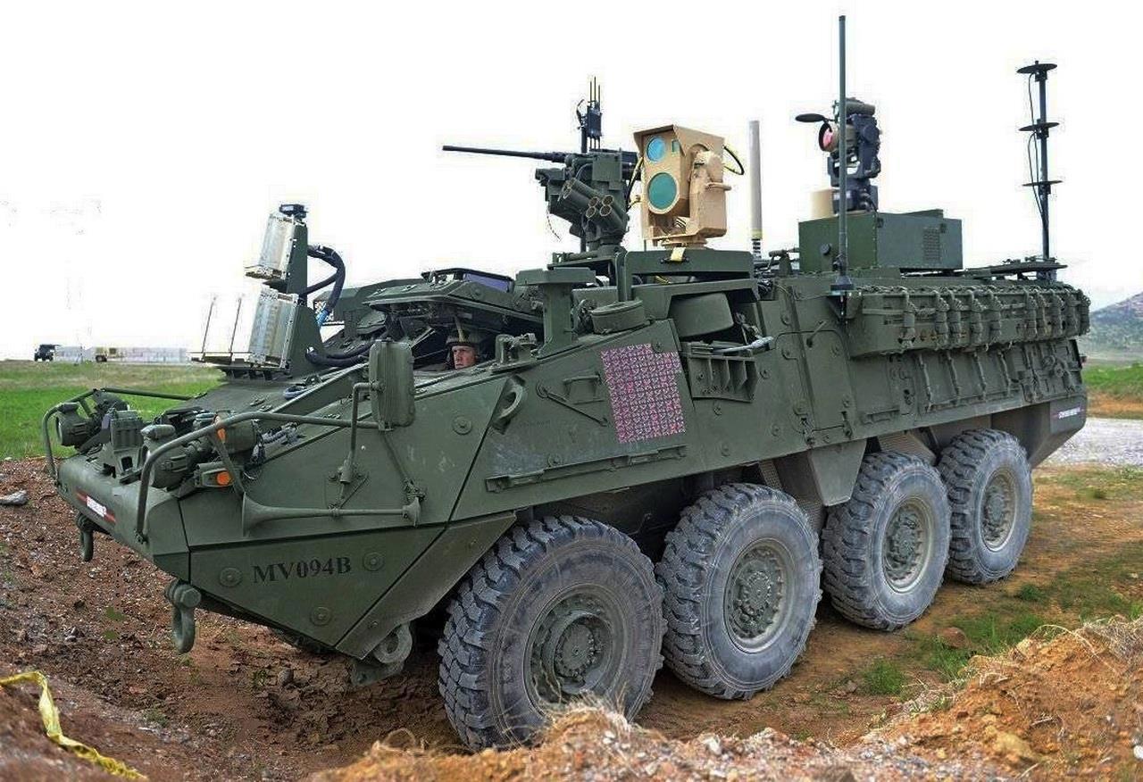 Но применение лазеров всё же обещало кроме борьбы с системами наблюдения и прицеливания дать защиту от беспилотников… работу продолжили. Из программы Stryker MEHEL она плавно перетекла в программу MHHEL (Multi-Mission High-Energy Laser). По ней предполагалось установить на тот же БТР «Stryker» лазер мощностью уже 50 кВт в 2021 году. А она должна смениться программой M-SHORAD (Maneuver – Short-Range Air Defence) по которой в 2022 году такие лазеры должны установить сразу на 4 машинах. Они должны быть испытаны в плане выполнения функций ПВО. То есть всё та же защита от БПЛА, неуправляемых ракет, снарядов, мин, авиации и вертолётов. Не совсем понятно, зачем сразу четыре машины, а не одну? Тут напрашивается всего один вывод – потому что так дороже. Машина с новой установкой стала выглядеть вот так: