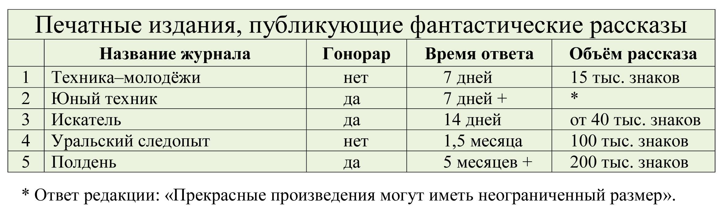Знаменитый журнал «Мир фантастики» в таблице отсутствует по весьма прозаической причине – он не работает с авторами и не принимает от них произведения. Однако, журнал следит за проводимыми в сети конкурсами фантастических рассказов и победителей может опубликовать на своих страницах.