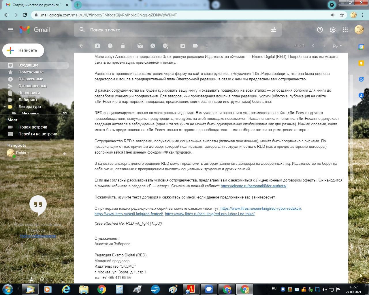 Столкнувшись уже однажды с Eksmo DidgitaL, мне совсем не хотелось наступать на старые грабли и я в начале хотела проигнорировать письмо. Однако перечитав то, что мне предлагают, а именно бесплатное продвижение в рамках проекта - я пришла к выводу, что могу подписать неисклюзивную оферту ( так как в принципе от того ничего не теряю). Действительно создается впечатление, что ты общаешься с живым человеком, а не с бездушной формой - автоматом. Хотя и форма письма представляет собой тот же самый шаблон - только с подставлением имен и названий. Ответы приходят с задержкой. Спустя только два дня после подписания (подставления галочки) договора мне прислали еще один шаблон с просьбой направить одним письмом данные своей биографии (авторской), аннотацию и референсы к обложки (по какой - то ограниченной юридической причине свою обложку ты отправить им не можешь).