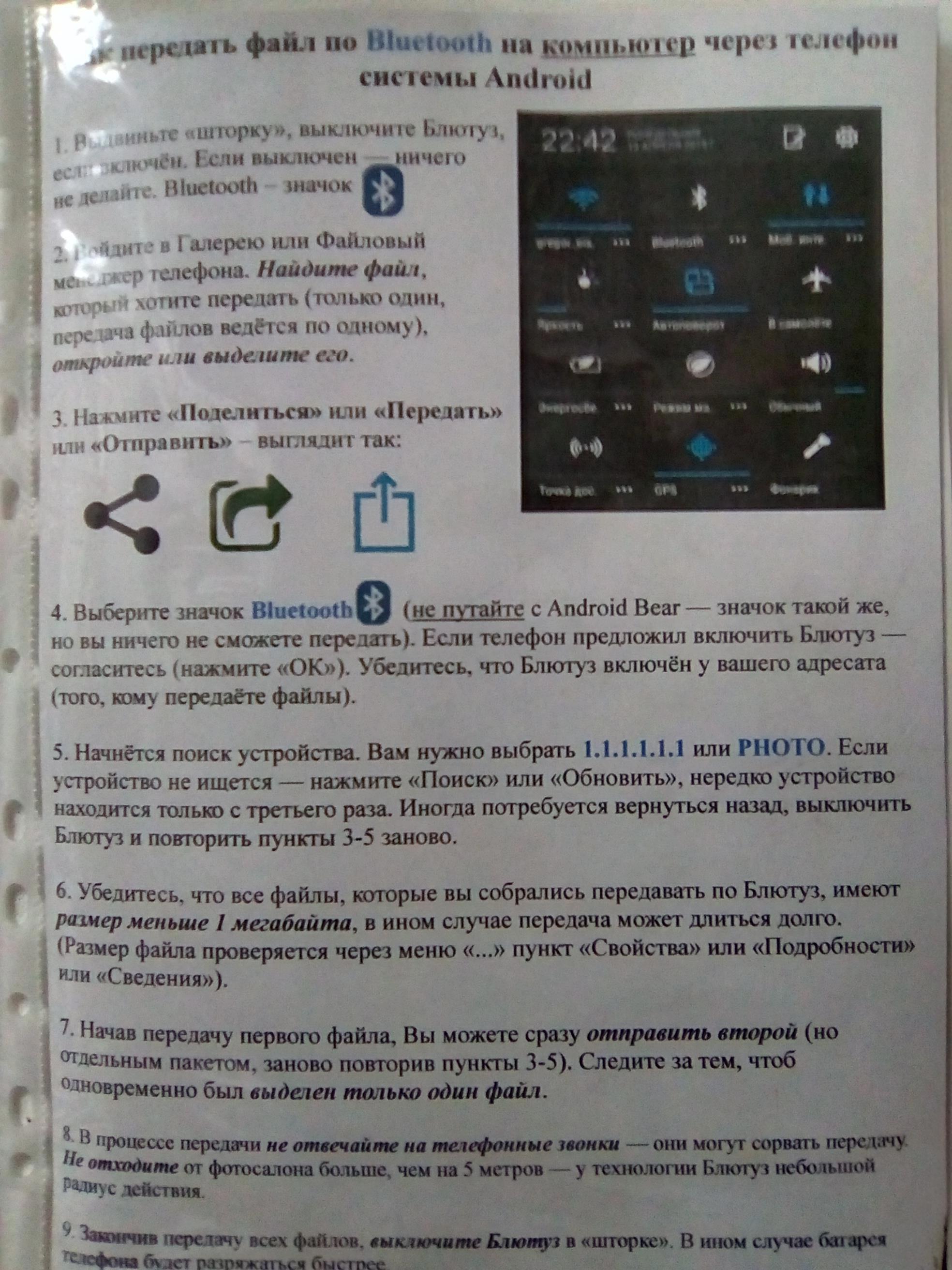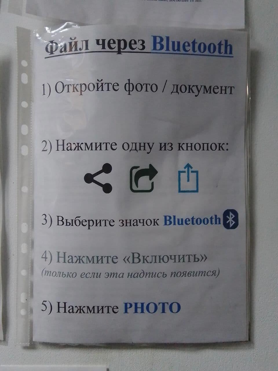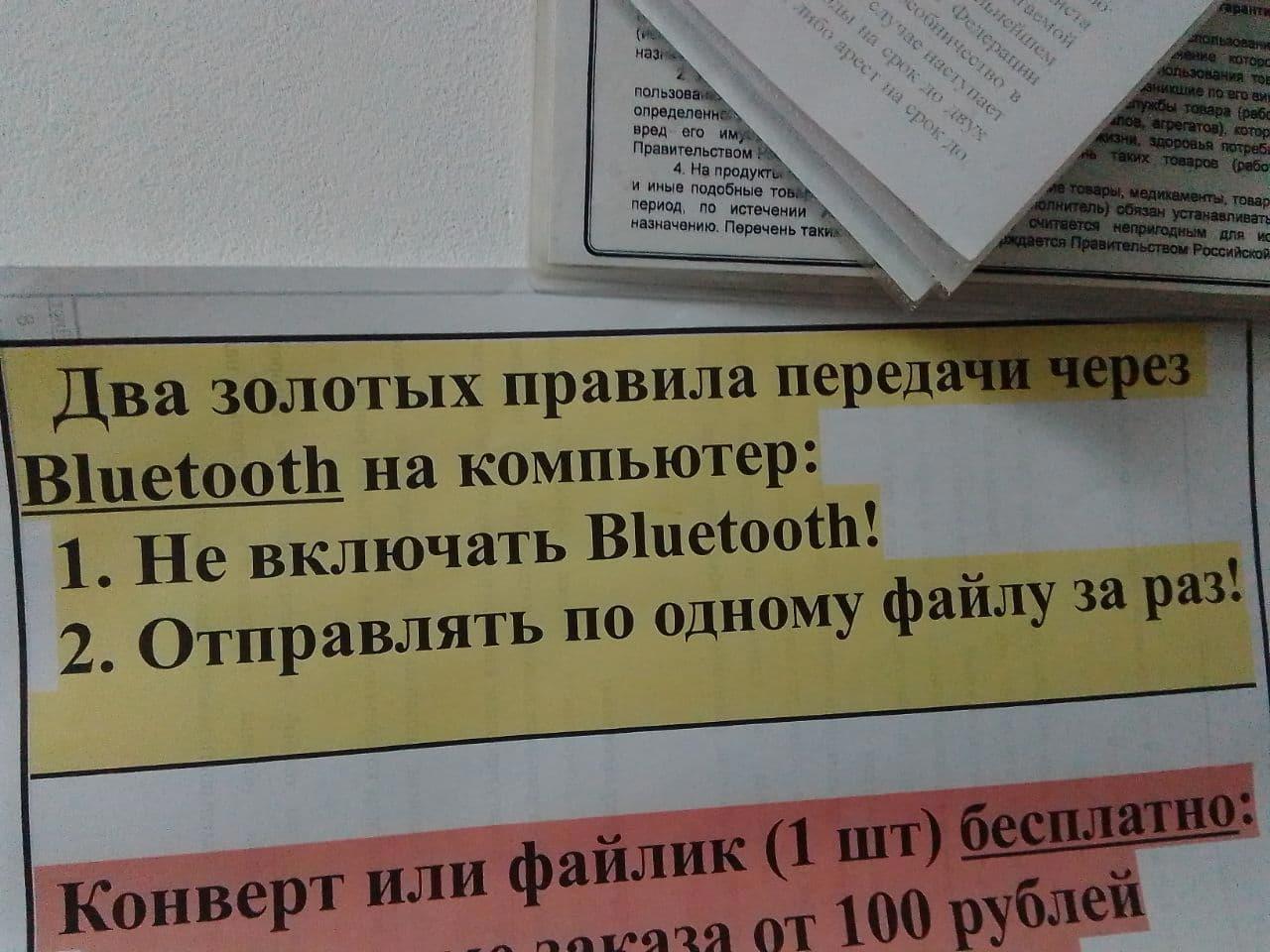 Работаю в сфере услуг. ЦА — куда уж шире? В процессе работы часто нужно, чтоб клиент перекинул что-то тебе по Bluetooth, причем не с телефона на телефон, а с телефона на комп. Здесь есть море нюансов и подводных камней. И однажды мне так надоело всё объяснять по триста раз, что я сделала гайд. Он занимал ровно один вордовский лист, висел на стене у всех на виду. И если у меня не было времени — оставалось показать на эту бумажку, открыть канал на компе и заниматься другими клиентами, пока к тебе приходят файлы.