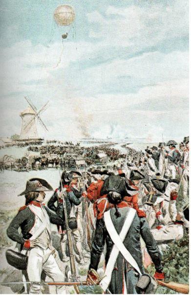Опасный подъём 29 октября 1795 года. Даже австрийцы прекратили стрельбу, наблюдая на этим запуском. Парламентёры с белыми флагами — это австрийские солдаты, которые хотели помочь удерживать воздушный шар.