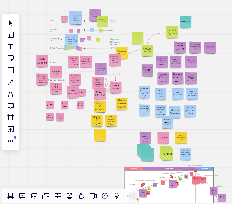 Начало будущего шЫдевра заложено, теперь создаем сюжет / завязываем взаимоотношения героев / раскладываем по полочкам свою задумку (в том числе по хронологии) – используем виртуальную (бесконечную) доску https://miro.com/